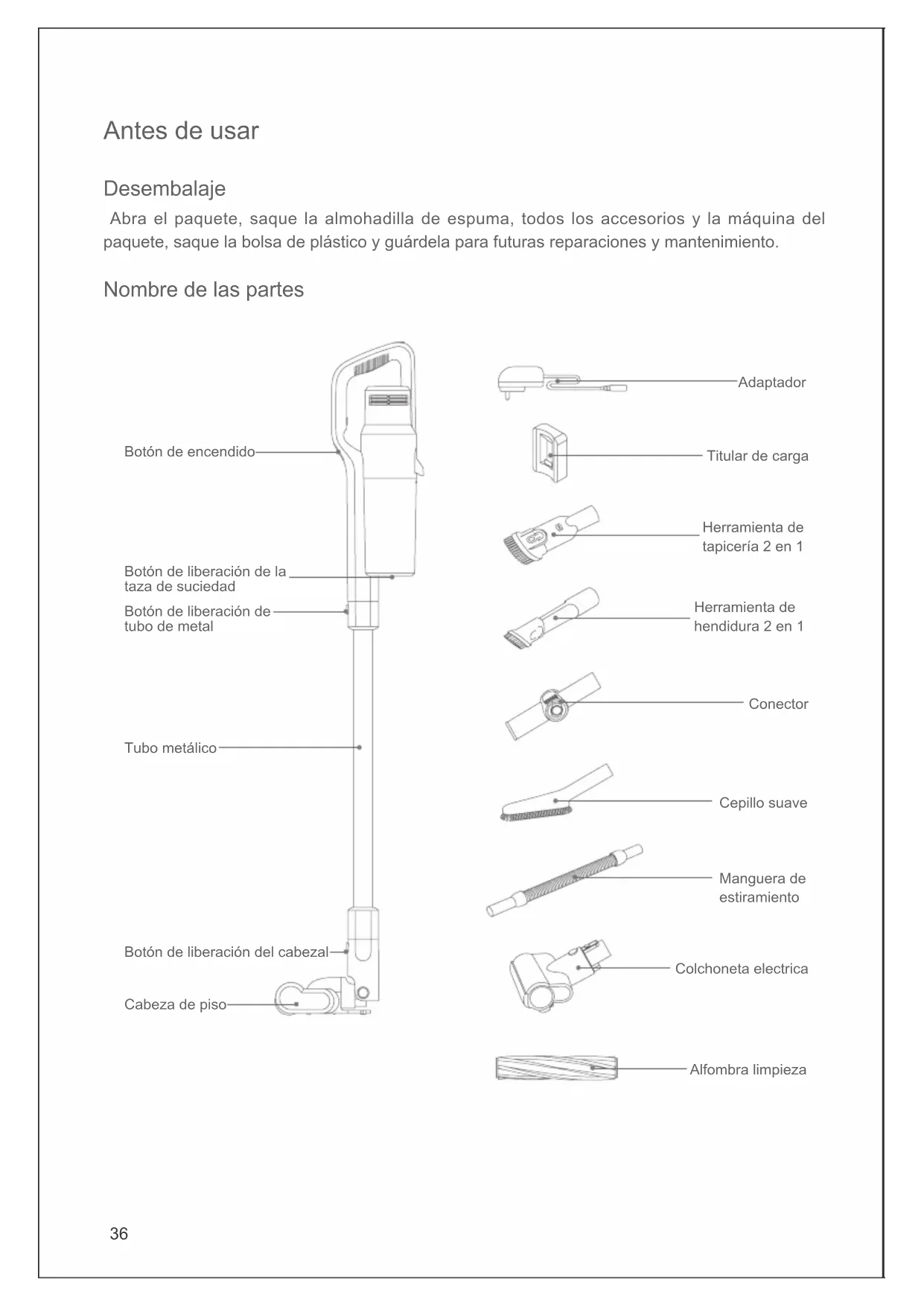 Botón de liberación del cepillo Botón de liberación del cabezal 1.Presione el botón de liberación del cepillo 2.Seque el cepillo Almacenamiento de la aspiradora Desmonte la cabeza del piso eléctrico y el tubo de metal Cuando almacene o limpie la aspiradora, si necesita desmontar el cabezal del piso eléctrico, presione el botón de liberación del cabezal del piso eléctrico, tire del tubo de metal hacia arriba.48 Safety Notes Esta aspiradora está diseñada para uso doméstico. No lo utilice para nes comerciales o de otro tipo. Lea detenidamente este manual de instrucciones antes de usarlo, guárdelo y guárdelo adecuadamente para usarlo en el futuro. No ponga la aspiradora cerca del fuego u otras instalaciones a altas temperaturas. No utilice ni almacene la máquina en condiciones extremas, por ejemplo, temperaturas extremas. Se recomienda utilizarlo en interiores a una temperatura de 5 a 40°C. Guarde la máquina en un lugar seco y evite la luz solar directa. Cargue completamente la batería antes del primer uso o después de un almacenamiento prolongado. Antes de usar la aspiradora, asegúrese de que el cepillo giratorio esté ensamblado, de lo contrario, podría ocasionar el bloqueo del ventilador del motor, causando que el motor se Desmonte el aspirador de mano y el tubo de metal Sostenga la computadora de mano, presione el botón de liberación del tubo de metal y sáquelo. Almacenamiento de la máquina Si la máquina no se utiliza durante mucho tiempo, empáquela adecuadamente y guárdela en un lugar fresco y seco, evitando la luz solar directa o el ambiente húmedo. Aspiradora de mano Botón de liberación de tubo de metal Tubo metálico49 apague. No utilice la aspiradora para recoger detergente, aceite, escoria de vidrio, aguja, ceniza de cigarrillo, polvo húmedo, agua, fósforos, etc. No utilice la aspiradora para recoger partículas pequeñas como cemento, polvo de yeso, polvo de pared u objetos grandes como bolas de papel, de lo contrario, podrían producirse fallos de funcionamiento, como el bloqueo y el desgaste del motor. Evite la obstrucción de la entrada de aire o del cepillo, ya que podría ocasionar fallas en el motor. No ponga la mano o el pie en la entrada del cabezal para evitar lesiones corporales. No vierta ni salpique agua u otros líquidos en la máquina para evitar cortocircuitos y quemar la máquina. Si el cepillo no funciona, compruebe si el cepillo está enredado con pelo u otra fibra larga, límpielo a tiempo. Cuando almacene la máquina durante mucho tiempo, asegúrese de que la batería esté completamente cargada antes de guardarla y cárguela al menos cada tres meses. Desenchufe el cargador para limpiar o reparar la máquina. Sostenga el cargador al enchufarlo o desenchufarlo, y no tire del cable de carga. Use un paño seco para limpiar la máquina. Líquidos como la gasolina, el alcohol, el diluyente de laca causarán grietas o decoloración del color y no se pueden usar. Si la máquina no está funcionando después de cargarla por completo, debe revisarla y repararla en nuestra ocina designada, no desmonte la máquina por su cuenta. La máquina desechada contiene baterías. Deben ser reciclados de forma segura. No los deseche al azar. Si hay daños en el cable de alimentación, para evitar peligros, debe ser reemplazado o reparado por la agencia de reparación o por una persona profesional.50 Solución de problemas Verique los siguientes problemas antes de enviarlos a las ocinas de reparación designadas. Problemas Causos posibles Soluciones Máquina no funciona La batería no tiene electricidad. Cargar la aspiradora Los tubos metálicos, cepillos para pisos, paquetes de baterías y aspiradoras de mano no están en su lugar Verifique que los componentes y la aspiradora de mano estén correctamente montados en su lugar La máquina deja de funcionar durante el uso La temperatura del motor principal se sobrecalienta y activa la protección de la temperatura Apaque la maquina durante 5-10 minutos Compruebe si el sistema de ciclón necesita limpieza Brushroll deja de funcionar durante el uso Cabeza del piso sobrecargada (como trabajar en una alfombra, demasiado pelo enredado alrededor del cepillo) Apaque la maquina durante 5-10 minutos Compruebe si necesita una limpieza del cepillo giratorio La máquina cae del modo fuerte al normal automáticamente El sistema Cyclone está bloqueado y activa el motor principal sobre la protección de velocidad Limpie el depósito de polvo y el sistema de ciclón Gotas de succion Taza de polvo esta llena Limpiar la copa de polvo y el ciclón Filtro bloqueado Limpie o reemplace el filtro Pista de aire cabeza de piso bloqueada Limpie la trayectoria del aire del cabezal El indicador de carga parpadean alternativamente en la luz verde y verde durante la carga El cargador tiene contacto suelto con la máquina o la toma de corriente Vuelva a enchufar el cargador a la máquina y la toma de corriente Poco tiempo de trabajo después de la carga La máquina no está completamente cargada Siga el manual de instrucciones para cargar completamente la batería Envejecimiento de la batería Reemplazar la batería Atención: Si ocurrieron otras fallas, que necesiten herramientas profesionales, para evitar peligros, la máquina debe ser reparada o reemplazada por el fabricante, otras ocinas de mantenimiento o profesionales de ocinas similares.51 Product Specication Technical Parameter Diagrama de circuito Nº de Modelo JV63 JV65 Voltage nominal 25.2V 28.8V Potencia nominal 450W 500W Voltaje de entrada del adaptador 100-240V ~ 50-60 Hz 100-240V ~ 50-60Hz Voltaje de salida del adaptador 30V 600mA 34.2V 600mA Número de modelo de cabeza de piso eléctrica JV63 JV65 Potencia nominal de la cabeza de piso eléctrica 30W 30W Número de modelo de cabezal de colchón eléctrico T-CS7.0B T-CS7.0A Potencia nominal de la cabeza del colchón eléctrico 20W 20W Capacidad de la batería 2500mAh 2500mAh Tiempo de carga 5h 5h