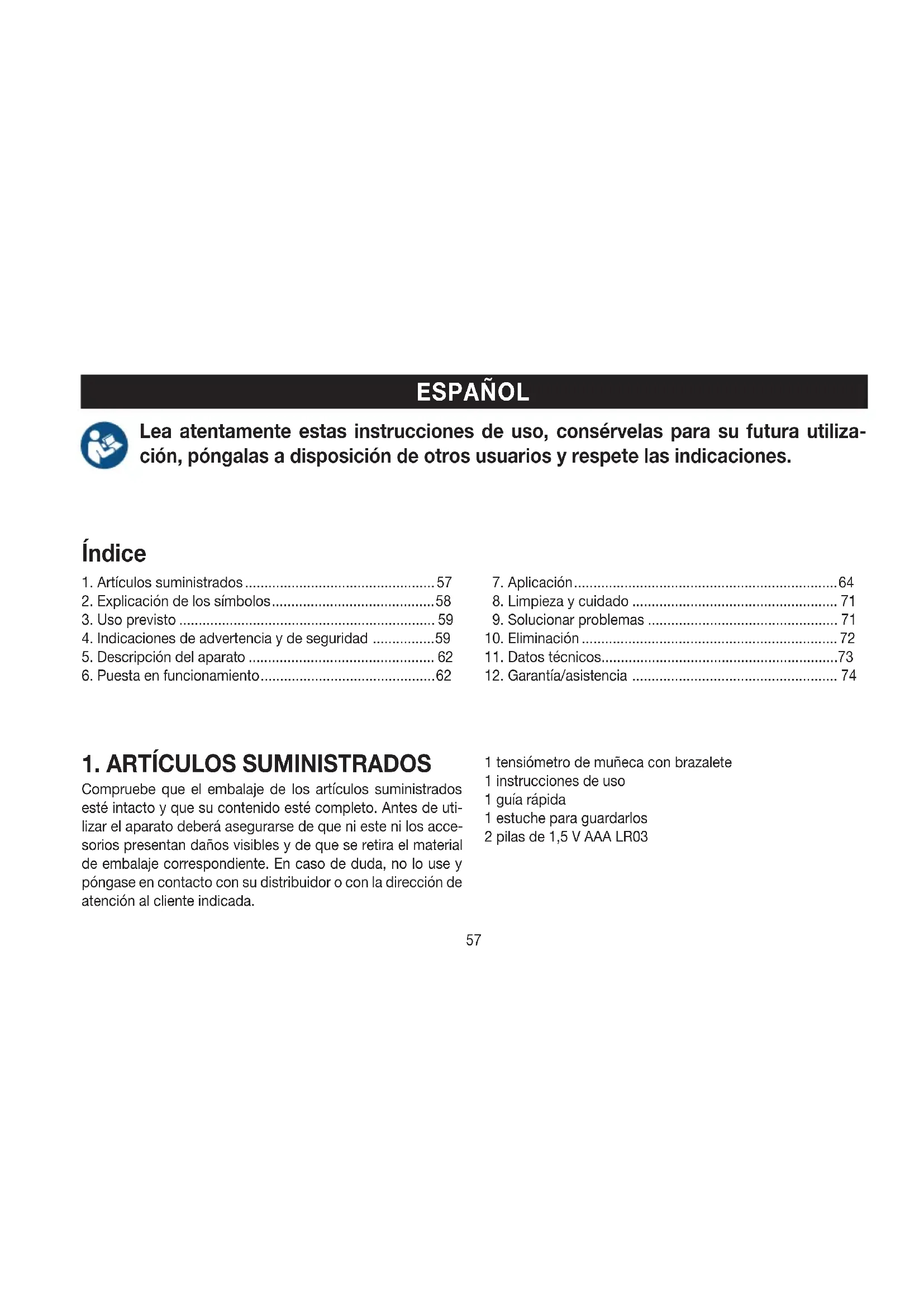 Compruebe que el embalaje de los artículos suministrados esté intacto y que su contenido esté completo. Antes de uti- lizar el aparato deberá asegurarse de que ni este ni los acce- sorios presentan daños visibles y de que se retira el material de embalaje correspondiente. En caso de duda, no lo use y póngase en contacto con su distribuidor o con la dirección de atención al cliente indicada. 1 tensiómetro de muñeca con brazalete 1 instrucciones de uso 1 guía rápida 1 estuche para guardarlos 2 pilas de 1,5V AAA LR0358
