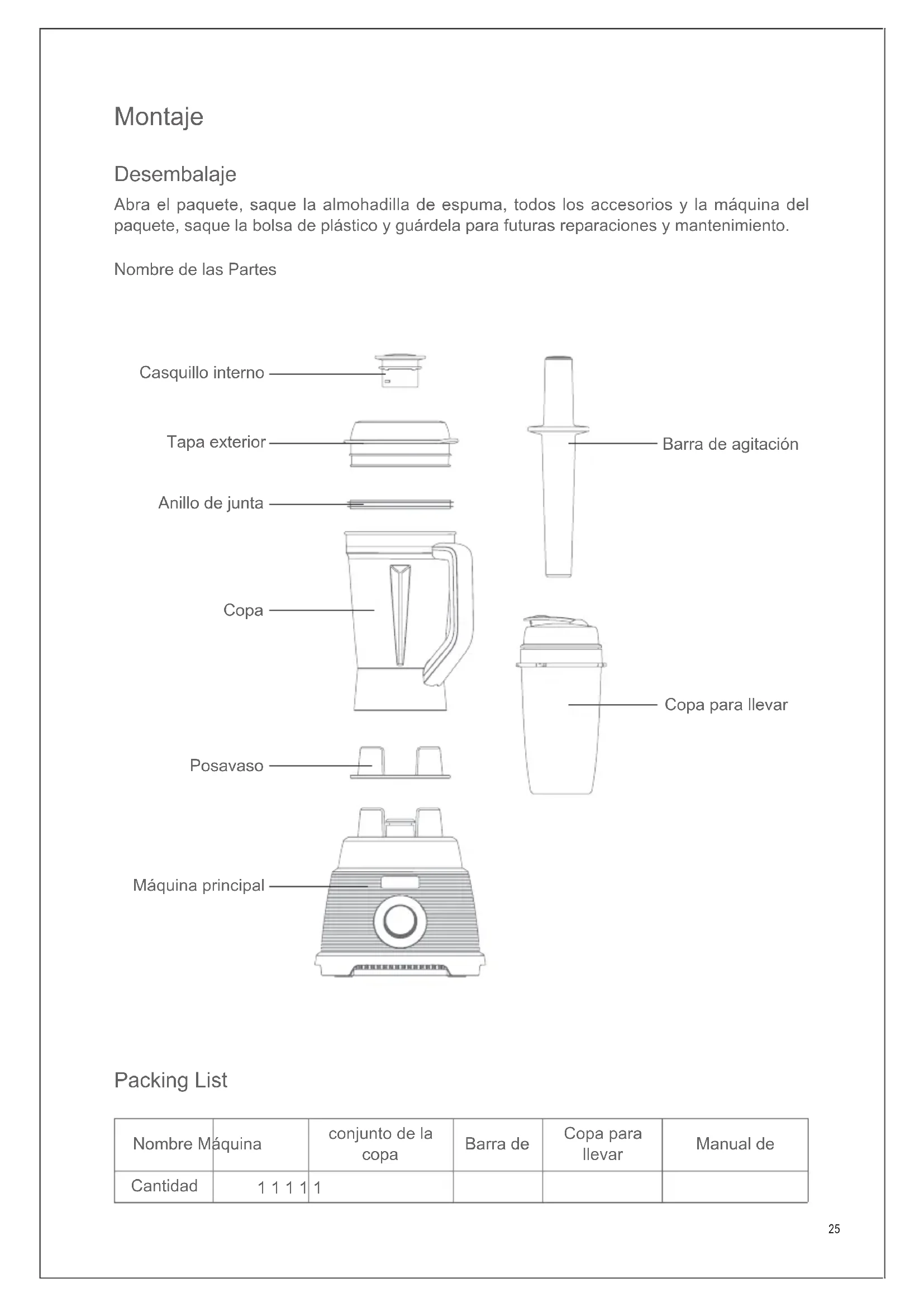 Limpieza y mantenimiento Limpieza de jarra de vaso Para su seguridad y salud, siga los siguientes pasos cuando utilice la máquina por primera vez: Llene la jarra con la mitad del agua cliente y agregue unas gotas de detergente. Bloquee bien la tapa exterior y la tapa interior. Gire a la función para arrancar la máquina. Después de que el trabajo se detenga, apague la máquina, vierta el líquido en la taza y luego lávela con agua limpia. Notas: no toque la cuchilla directamente con las manos, en caso de que la cuchilla le corte los dedos, puede utilizar herramientas para ayudar en la limpieza. Limpieza de la tapa interna, la tapa exterior, el ensamblaje de la cuchilla y el anillo de la junta. Separe la tapa interior, la tapa exterior, el conjunto de la cuchilla y el anillo de la junta. Lávelos y el empujador con detergente en agua tibia, luego enjuáguelos con agua corriente y séquelos. Por favor, vuelva a instalar antes de usar. Limpieza de la máquina principal Desenchufe antes de limpiar. Empape un paño suave o una esponja con la mezcla de detergente y agua tibia, luego limpie la supercie exterior de la máquina principal con un paño suave o una esponja. No ponga la máquina principal directamente en agua para lavar o enjuagar directamente con agua. Limpie a fondo el panel y la perilla de control de velocidad para garantizar su funcionamiento flexible. Si alguna sustancia líquida o pegajosa se pega a la superficie de la máquina principal durante la operación, retírela inmediatamente. Limpie con un paño suave, a n de no rayar la apariencia del host. No use detergentes o líquidos corrosivos para limpiar, y espere a que la máquina principal se seque completamente antes de guardarla.29 Selección de funciones materiales adecuados para el procesamiento en modos inteligentes correspondientes Funcciones materiales adecuados correspondientes Manzana, piña, sandía, naranja, tomate, espinacas, vegetales verdes, brócoli, etc Fruta con yogur Cubitos de hielo o frutas congeladas, como manzana, piña, melocotón, plátano, etc Yema de huevo cocida, pescado, carne magra, tofu, cereales integrales, deos, pan, etc Soja frita, maní, sésamo, etc Limpie la jarra materiales adecuados para el procesamiento en los modos manuales correspondientes Nivel materiales adecuados correspondientes 1-2 materiales súper suaves, utilizados para mezclar algunos materiales líquidos, agitación de salsa líquida viscosa 3-4 Se usa para revolver algunas frutas blandas, como tomates, sandías, naranjas, etc. Trituración de granos cocidos y frijoles, Trituración de frutas duras, como las zanahorias 5-6 Utilizado para triturar carne cocida con sopa, moler nueces, granos secos, frijoles secos. Elaboración de batidos. Trituración de cristales duros, como los caramelos de roca.30 Notas: Lea este manual detenidamente antes de usarlo y consérvelo para futuras consultas. Este producto es sólo para uso doméstico general. Antes de conectar el producto a la fuente de alimentación, conrme si el voltaje marcado en la parte inferior de la máquina principal es consistente con la tensión de la fuente de alimentación local. Deje de usar el producto cuando el cable de alimentación, el enchufe u otras partes estén dañados. No permita que niños o personas sin capacidad independiente o experiencia relevante usen este producto solo. Si el cable de alimentación está dañado, debe ser reemplazado y reparado por un profesional del departamento de mantenimiento del fabricante o departamento similar para evitar peligros. No use este producto en la supercie con agua o supercies irregulares. No permita que el cuerpo del recipiente, el host o el cable de alimentación toquen la supercie caliente. No exceda el volumen máximo marcado en el cuerpo del frasco cuando lo use. Por favor, opere cuando la tapa exterior y la tapa interna estén en su lugar. Solo retire la tapa cuando agregue los materiales. Apague la máquina hasta que la cuchilla deje de funcionar por completo, luego retire la jarra de la máquina principal. No toque las partes móviles. No deje objetos extraños (como cucharas, palillos, tenedores, etc.) en el recipiente de mezcla. Si hay algún objeto extraño en el recipiente al arrancar la máquina, dañará la máquina y puede causar lesiones personales. No utilice accesorios o componentes de otros fabricantes o de fabricantes no recomendados. Antes de cada uso de la máquina, compruebe el cuerpo del vaso y la cuchilla. Si encuentra grietas en el cuerpo de la jarra, cuchilla suelta o daños, no vuelva a usar este producto y póngase en contacto con el centro de servicio más cercano. Tenga mucho cuidado con la cuchilla cuando vacíe o limpie la jarra para evitar lesiones. No ponga sus manos u otros objetos en el recipiente durante la agitación para evitar el peligro personal o daños a la máquina. Antes de retirar el cuerpo del frasco para limpiarlo, el cuerpo del frasco solo puede retirarse de la máquina hasta que la cuchilla deje de girar por completo. Asegúrese de desenchufar el producto después de usarlo. No sumerja la máquina principal en agua u otros líquidos, y no lave el cuerpo para evitar descargas eléctricas.31 No sumerja la máquina principal en agua u otros líquidos, y no lave el cuerpo para evitar descargas eléctricas. Al preparar alimentos grasos o moler materiales secos, la mezcla debe agitarse continuamente en el frasco durante no más de 1 minutos. Agitar demasiado tiempo puede dañar la jarra o hacer que el motor se sobrecaliente.32 Solución de problemas Por favor verique los siguientes problemas antes de enviarlos a las ocinas de reparación designadas. Problemas Causos posibles Soluciones La máquina no funciona y el panel de visualización está apagado No conectado a la fuente de alimentación Conecte la fuente de alimentación La jarra de mezcla no está instalada correctamente Retire el recipiente de mezcla e instálelo nuevamente en la máquina principal Blade does