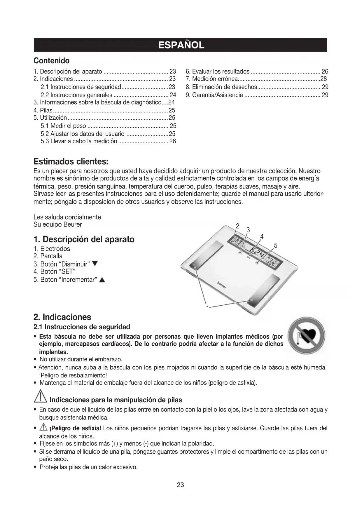 - Esta báscula no debe ser utilizada por personas que lleven implantes médicos (por ejemplo, marcapasos cardíacos). De lo contrario podría afectar a la función de dichos implantes.• No utilizar durante el embarazo. • Atención, nunca suba a la báscula con los pies mojados ni cuando la superficie de la báscula esté húmeda. ¡Peligro de resbalamiento!• Mantenga el material de embalaje fuera del alcance de los niños (peligro de asfixia). Indicaciones para la manipulación de pilas