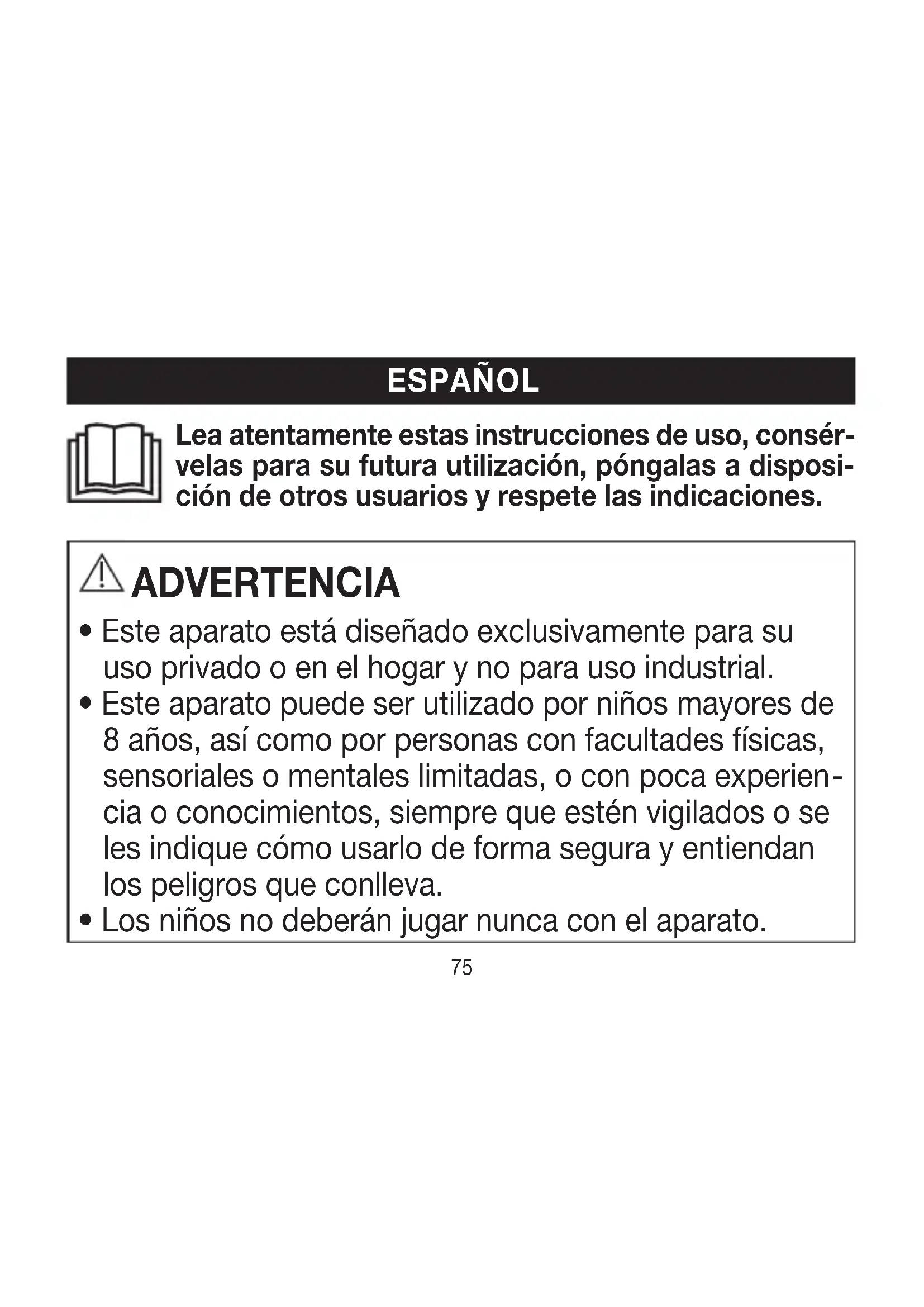- Los niños no deberán jugar nunca con el aparato. Lea atentamente estas instrucciones de uso, consér- velas para su futura utilización, póngalas a disposi- ción de otros usuarios y respete las indicaciones. ESPAÑOL76 77