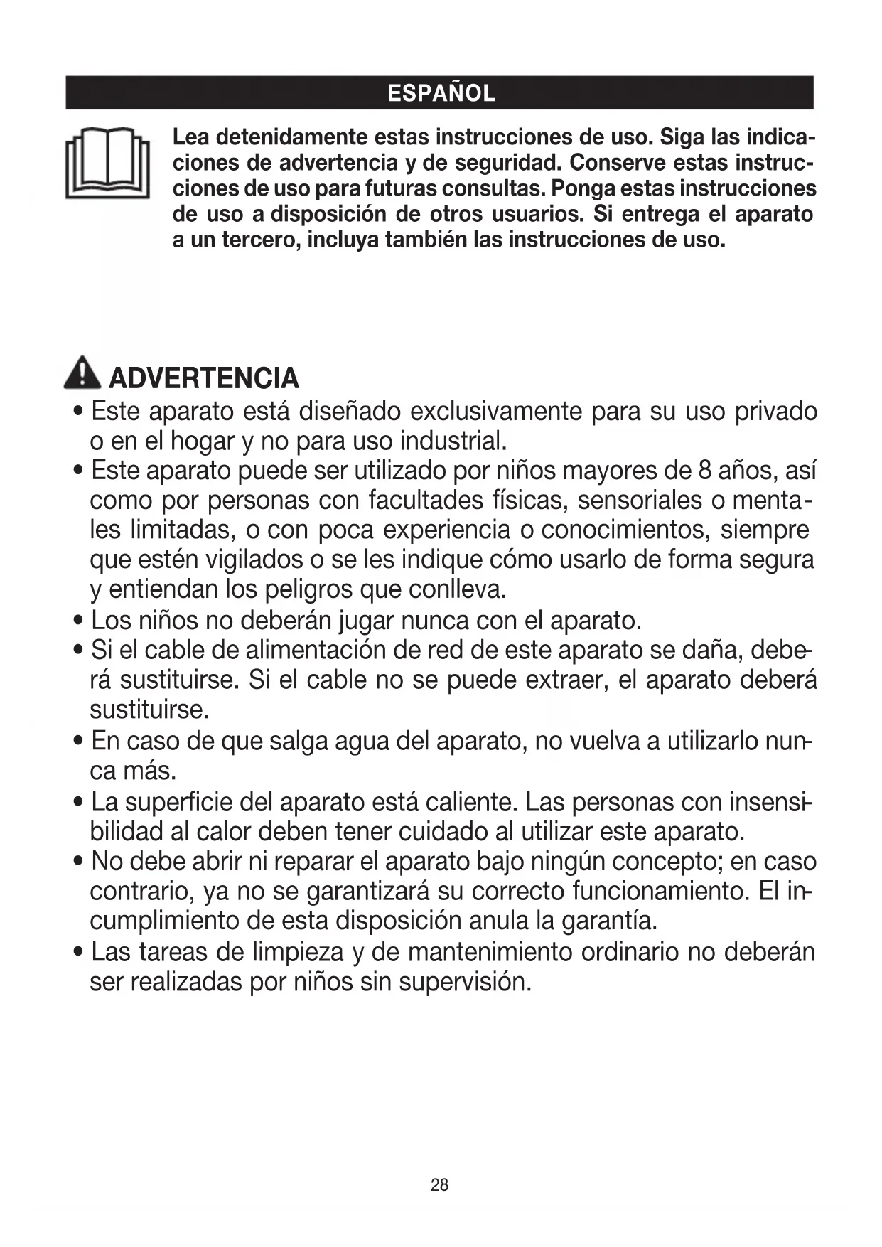 Pour de plus amples informations sur la garantie et les conditions de garantie, consultez la fiche de garantie fournie.28 Lea detenidamente estas instrucciones de uso. Siga las indica- ciones de advertencia yde seguridad. Conserve estas instruc- ciones de uso para futuras consultas. Ponga estas instrucciones de uso adisposición de otros usuarios. Si entrega el aparato aun tercero, incluya también las instrucciones de uso. ESPAÑOL ADVERTENCIA