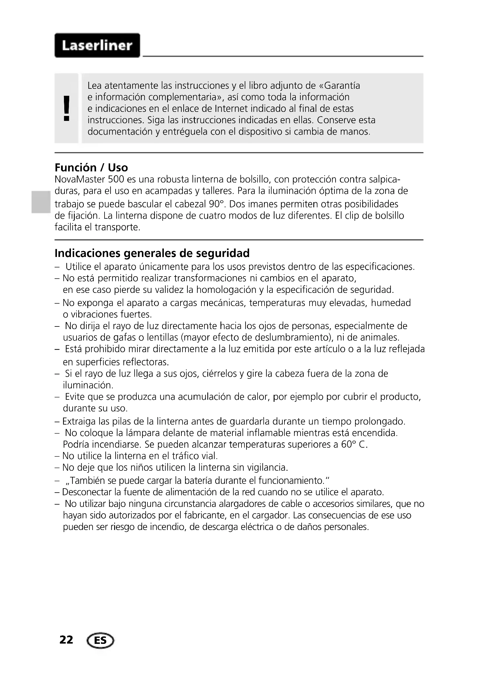 Indicaciones generales de seguridad – Utilice el aparato únicamente para los usos previstos dentro de las especificaciones. – No está permitido realizar transformaciones ni cambios en el aparato, en ese caso pierde su validez la homologación y la especificación de seguridad. – No exponga el aparato a cargas mecánicas, temperaturas muy elevadas, humedad o vibraciones fuertes. – No dirija el rayo de luz directamente hacia los ojos de personas, especialmente de usuarios de gafas o lentillas (mayor efecto de deslumbramiento), ni de animales. – Está prohibido mirar directamente a la luz emitida por este artículo o a la luz reejada en supercies reectoras. – Si el rayo de luz llega a sus ojos, ciérrelos y gire la cabeza fuera de la zona de iluminación. – Evite que se produzca una acumulación de calor, por ejemplo por cubrir el producto, durante su uso. – Extraiga las pilas de la linterna antes de guardarla durante un tiempo prolongado. – No coloque la lámpara delante de material inamable mientras está encendida. Podría incendiarse. Se pueden alcanzar temperaturas superiores a 60° C. – No utilice la linterna en el tráco vial. – No deje que los niños utilicen la linterna sin vigilancia. – „También se puede cargar la batería durante el funcionamiento.“ – Desconectar la fuente de alimentación de la red cuando no se utilice el aparato. – No utilizar bajo ninguna circunstancia alargadores de cable o accesorios similares, que no hayan sido autorizados por el fabricante, en el cargador. Las consecuencias de ese uso pueden ser riesgo de incendio, de descarga eléctrica o de daños personales. Función / Uso NovaMaster 500 es una robusta linterna de bolsillo, con protección contra salpica- duras, para el uso en acampadas y talleres. Para la iluminación óptima de la zona de trabajo se puede bascular el cabezal 90°. Dos imanes permiten otras posibilidades de jación. La linterna dispone de cuatro modos de luz diferentes. El clip de bolsillo facilita el transporte. Lea atentamente las instrucciones y el libro adjunto de «Garantía e información complementaria», así como toda la información e indicaciones en el enlace de Internet indicado al final de estas instrucciones. Siga las instrucciones indicadas en ellas. Conserve esta documentación y entréguela con el dispositivo si cambia de manos. !NovaMaster 500