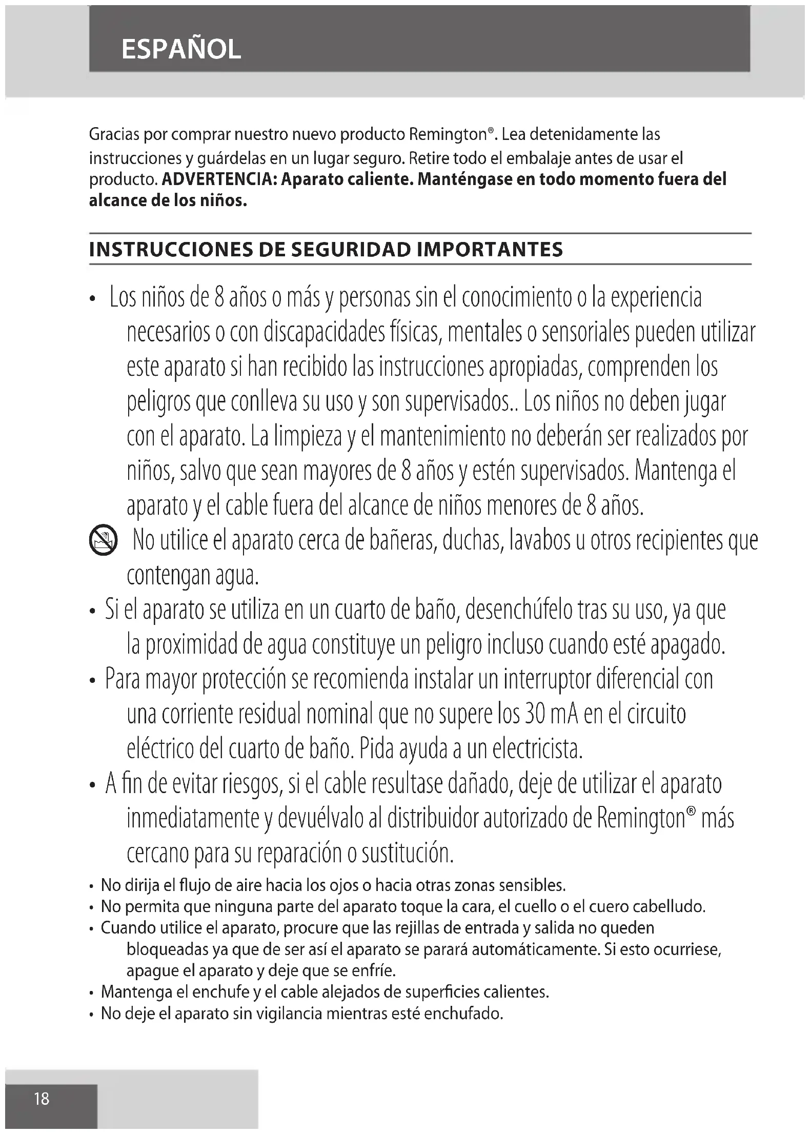 AE18 Gracias por comprar nuestro nuevo producto Remington®. Lea detenidamente las instrucciones y guárdelas en un lugar seguro. Retire todo el embalaje antes de usar el producto. ADVERTENCIA: Aparato caliente. Manténgase en todo momento fuera del alcance de los niños.