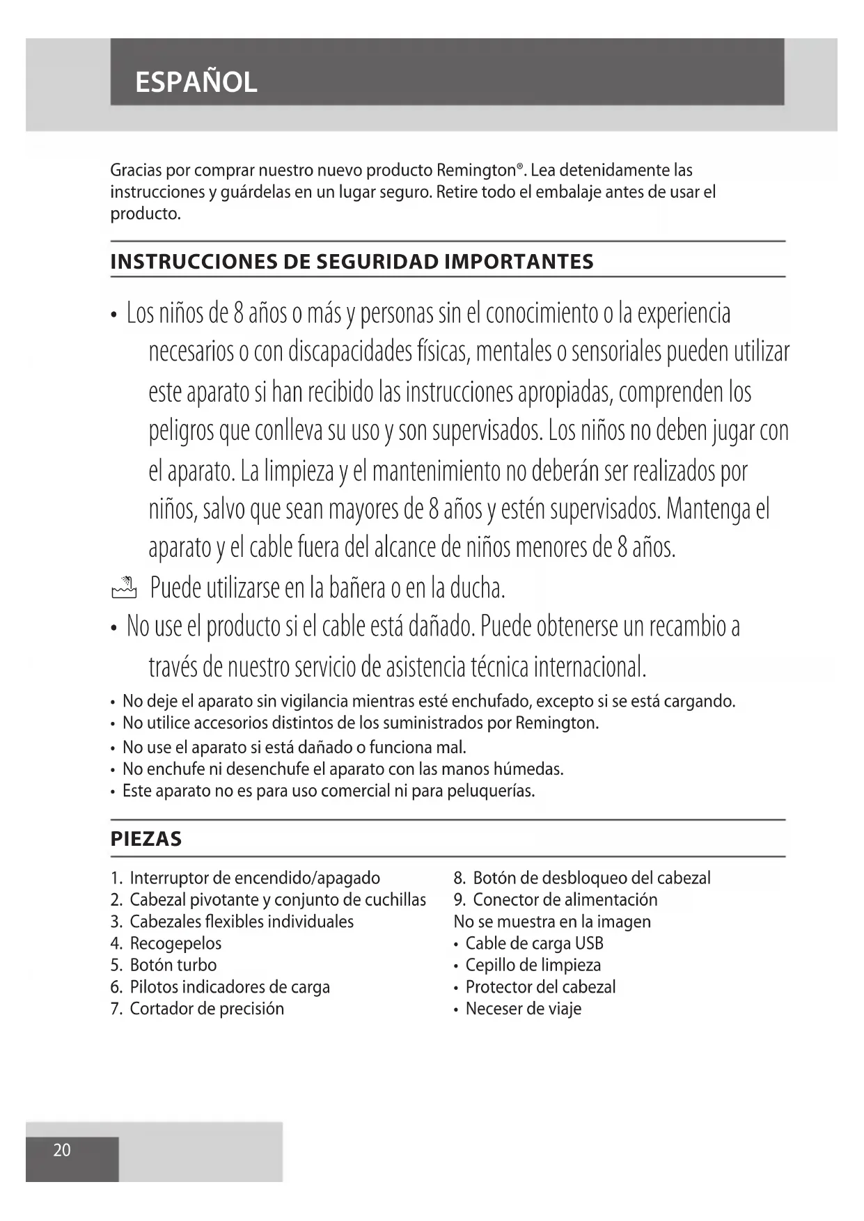 AE20 ESPAÑOL Gracias por comprar nuestro nuevo producto Remington®. Lea detenidamente las instrucciones y guárdelas en un lugar seguro. Retire todo el embalaje antes de usar el producto.