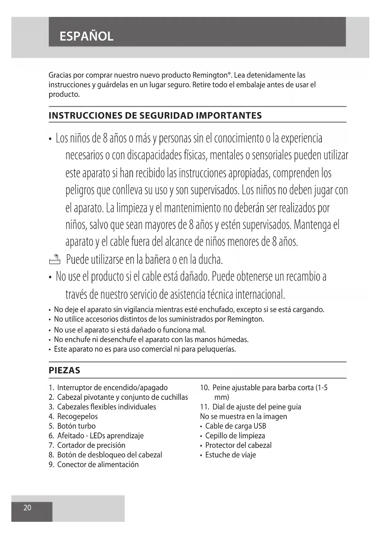 - No utilice accesorios distintos de los suministrados por Remington.
