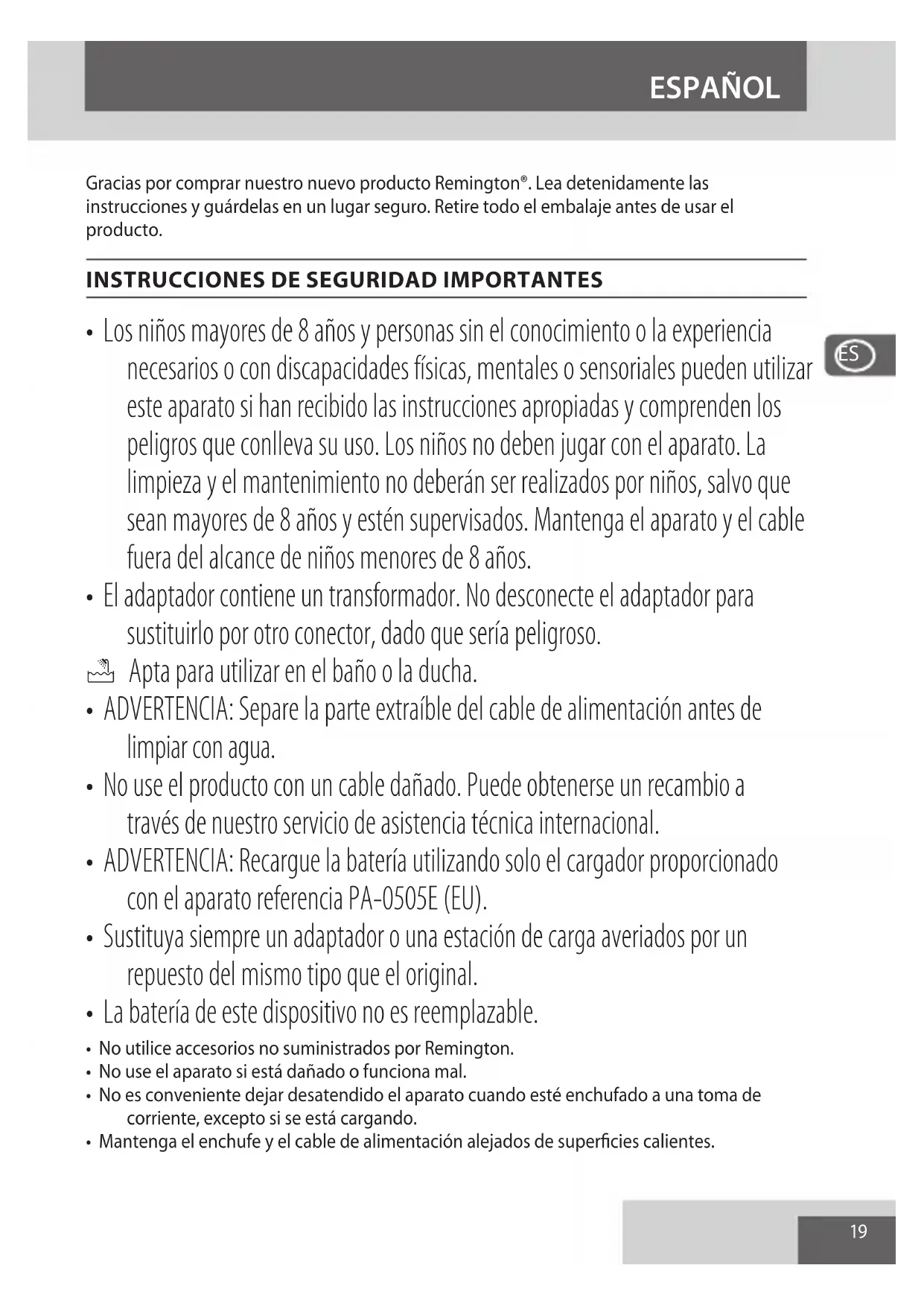 - No utilice accesorios no suministrados por Remington. • No use el aparato si está dañado o funciona mal.• No es conveniente dejar desatendido el aparato cuando esté enchufado a una toma de corriente, excepto si se está cargando.• Mantenga el enchufe y el cable de alimentación alejados de supercies calientes. ESPAÑOL