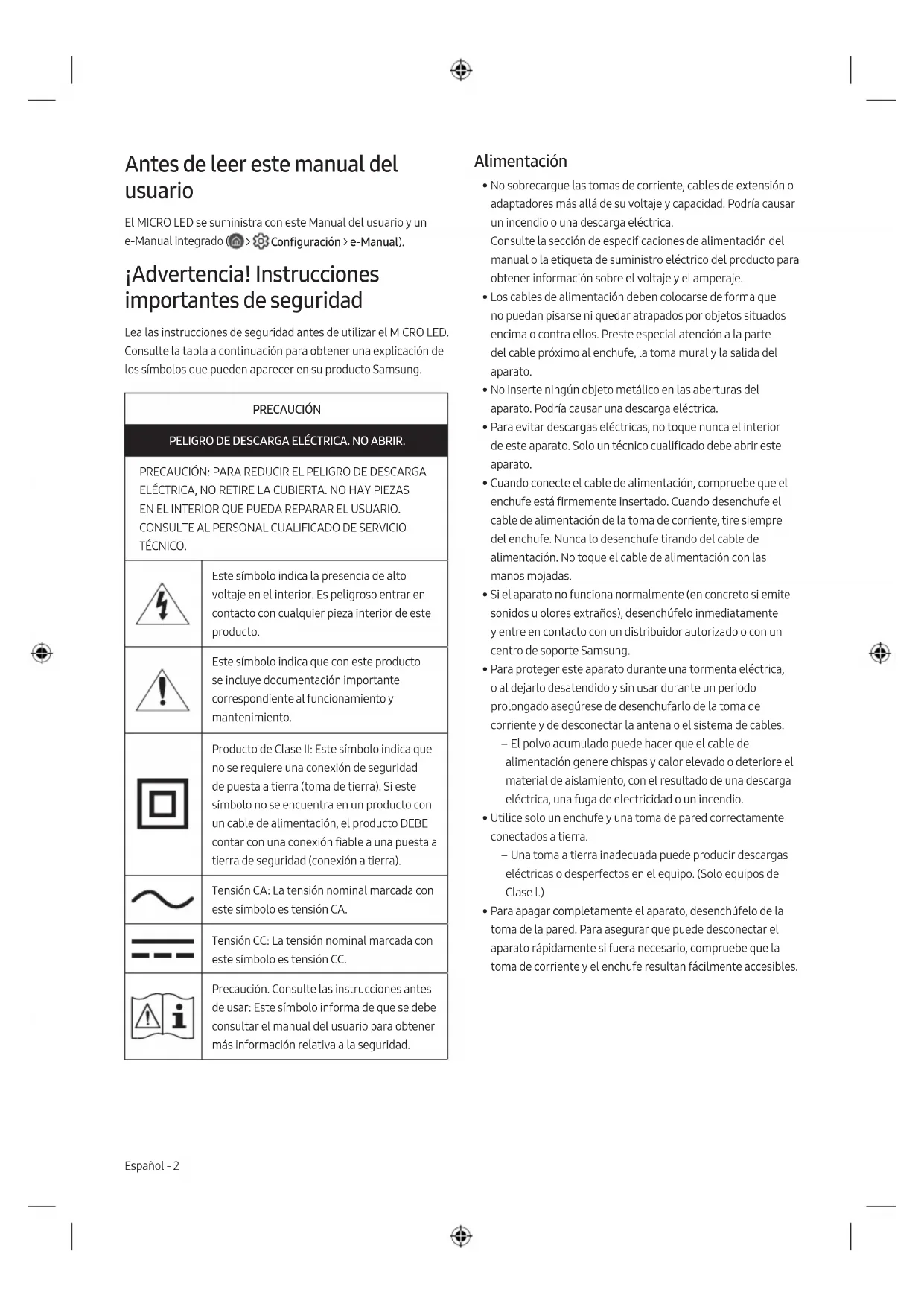 - Las figuras y las ilustraciones de este manual del usuario se proporcionan como referencia solamente y pueden no coincidir con el aspecto real del producto. El diseño y las especificaciones del producto están sujetos a cambios sin previo aviso. Español - 9 EspañolPor el presente documento, Samsung declara que este equipo de radio cumple con la Directiva 2014/53/UE y los requisitos legales pertinentes del Reino Unido. El texto completo de la declaración de conformidad se encuentra disponible en la siguiente dirección de Internet: http://www.samsung.com vaya a Soporte e introduzca el nombre del modelo. Este equipo puede funcionar en todos los países de la UE y en el Reino Unido. La función 5 GHz WLAN (wifi) del equipo solo se debe utilizar en interiores. Potencia máxima del transmisor BT: 100 mW a 2,4GHz – 2,4835 GHz Potencia máxima del transmisor Wi-Fi: 100mW a 2,4GHz- 2,4835GHz, 200mW a 5,15GHz-5,25GHz, 100mW 5,25GHz- 5,35GHz & 5,47GHz - 5,725GHz Correcta eliminación del producto (desechos de equipos eléctricos y electrónicos) (Aplicable en países con sistemas de recogida selectiva) Esta marca en el producto, los accesorios o la documentación indica que el producto y los accesorios electrónicos (como cargador, auriculares, cable USB) no se deben desechar junto al resto de la basura doméstica. Para prevenir posibles daños al entorno ambiental o a las personas por una eliminación incontrolada, cuando decida desprenderse del aparato debe acudir a un centro de reciclaje donde se promueva la reutilización sostenible de los recursos materiales. Los usuarios particulares pueden ponerse en contacto con el centro donde adquirieron el aparato o con alguna oficina municipal donde le informarán de dónde debe depositar el electrodoméstico para su reciclaje. Los comerciantes deben ponerse en contacto con el distribuidor y comprobar los términos y las condiciones del contrato de compra. Este producto y sus accesorios electrónicos no se deben mezclar con otros deshechos comerciales para su eliminación. En caso de reparación del producto por parte de un servicio técnico no autorizado, reparación por cuenta propia o no profesional del producto, Samsung no es responsable de ningún daño al producto, ninguna lesión o cualquier otro problema relativo a la seguridad del producto causado por cualquier intento de reparar el producto, si no sigue cuidadosamente estas instrucciones de reparación y mantenimiento. Cualquier daño al producto causado por un intento de reparar el producto por cualquier persona que no sea un Servicio Técnico Certificado por Samsung no estará cubierto por la garantía. Por favor, visite samsung.com/es/support/ para encontrar más información acerca del adaptador de alimentación externo y mando a distancia bajo la normativa Ecodesing EU. Reducción del consumo de energía El MICRO LED entra en modo de espera cuando lo apaga. Cuando está en modo de espera, sigue consumiendo una pequeña cantidad de energía. Para reducir el consumo de energía, desenchufe el cable de alimentación si no tiene intención de utilizar el MICRO LED durante un periodo largo. Licencias The terms HDMI and HDMI High-Definition Multimedia Interface, and the HDMI Logo are trademarks or registered trademarks of HDMI Licensing Administrator, Inc. in the United States and other countries. Español - 10Correcta eliminación de las pilas de este producto (Aplicable en países con sistemas de recogida selectiva) La presencia de esta marca en la batería, el manual o el envase indica que la batería de este producto no debe eliminarse junto con otros residuos domésticos. Los símbolos químicos Hg, Cd o Pb, si aparecen, indican que la batería contiene mercurio, cadmio o plomo en niveles superiores a los valores de referencia de la Directiva CE 2006/66. El usuario no debe sustituir la batería que incluye este producto. Para obtener información sobre cómo cambiarla, póngase en contacto con su proveedor de servicio técnico. No extraiga la batería ni la arroje al fuego. No desmonte, aplaste o perfore la batería. Si va a deshacerse del producto, el centro de recogida de residuos tomará las medidas oportunas para el reciclado y tratamiento del producto, incluida la batería. Extracción de la batería