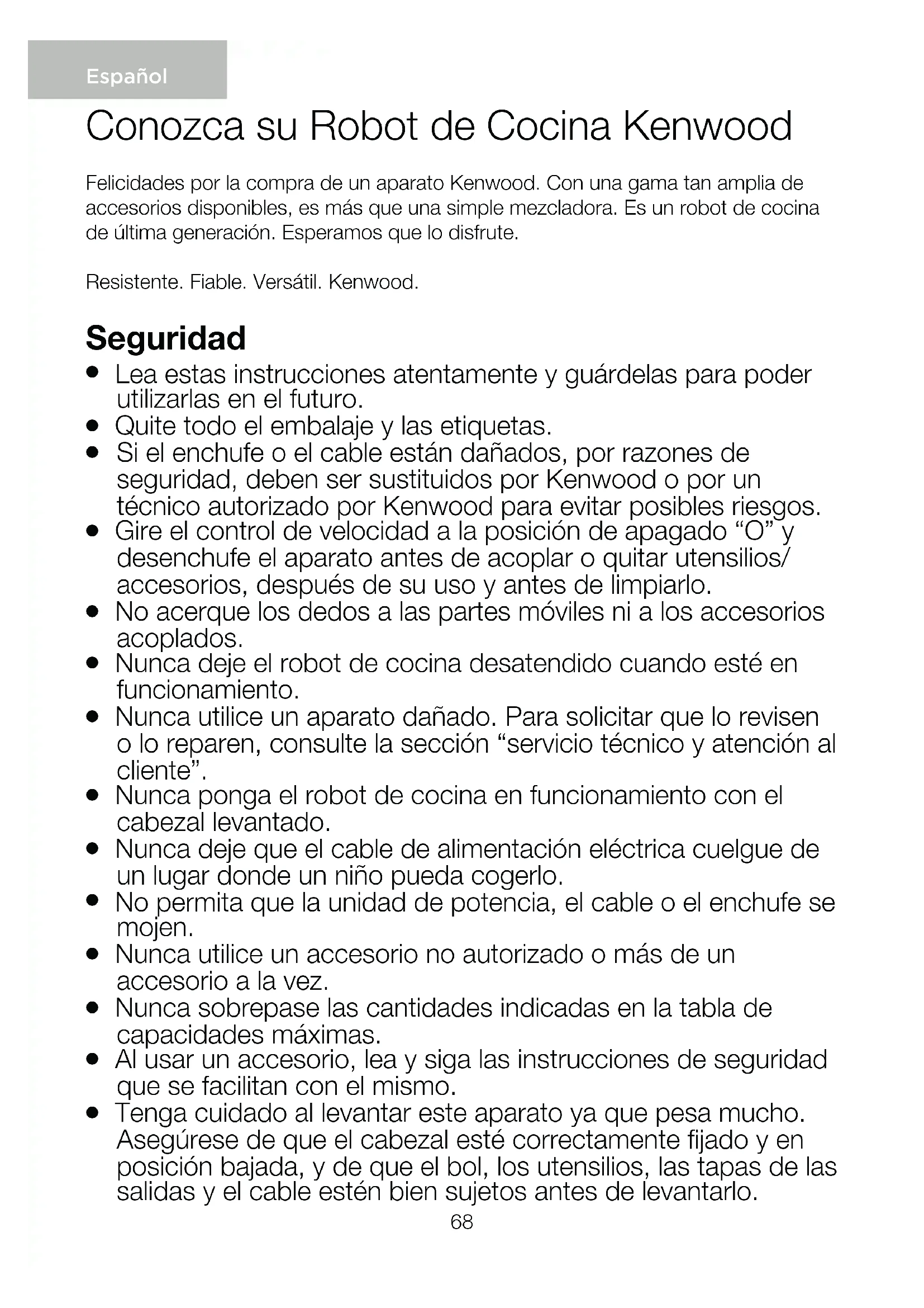 Utilice este aparato únicamente para el uso doméstico al que está destinado. Kenwood no se hará cargo de responsabilidad alguna si el aparato se somete a un uso inadecuado o si no se siguen estas instrucciones. Antes de enchufar el aparato