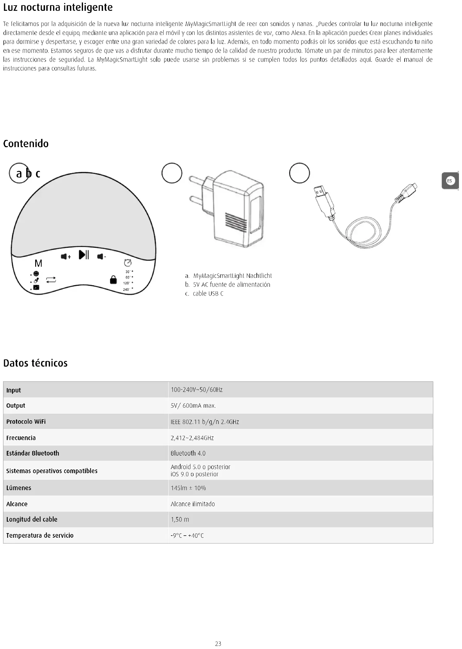 22Input 100-240V~50/60Hz Output 5V/ 600mA max. Protocolo WiFi IEEE 802.11 b/g/n 2.4GHz Frecuencia 2,412~2,484GHz Estándar Bluetooth Bluetooth 4.0 Sistemas operativos compatibles Android 5.0 o posterior iOS 9.0 o posterior Lúmenes 145lm ± 10% Alcance Alcance ilimitado Longitud del cable 1,50 m Temperatura de servicio -9°C – +40°C Datos técnicos Luz nocturna inteligente Te felicitamos por la adquisición de la nueva luz nocturna inteligente MyMagicSmartLight de reer con sonidos y nanas. „Puedes controlar tu luz nocturna inteligente directamente desde el equipo, mediante una aplicación para el móvil y con los distintos asistentes de voz, como Alexa. En la aplicación puedes Crear planes individuales para dormirse y despertarse, y escoger entre una gran variedad de colores para la luz. Además, en todo momento podrás oír los sonidos que está escuchando tu niño en ese momento. Estamos seguros de que vas a disfrutar durante mucho tiempo de la calidad de nuestro producto. Tómate un par de minutos para leer atentamente las instrucciones de seguridad. La MyMagicSmartLight solo puede usarse sin problemas si se cumplen todos los puntos detallados aquí. Guarde el manual de instrucciones para consultas futuras. Contenido a. MyMagicSmartLight Nachtlicht b. 5V AC fuente de alimentación c. cable USB C