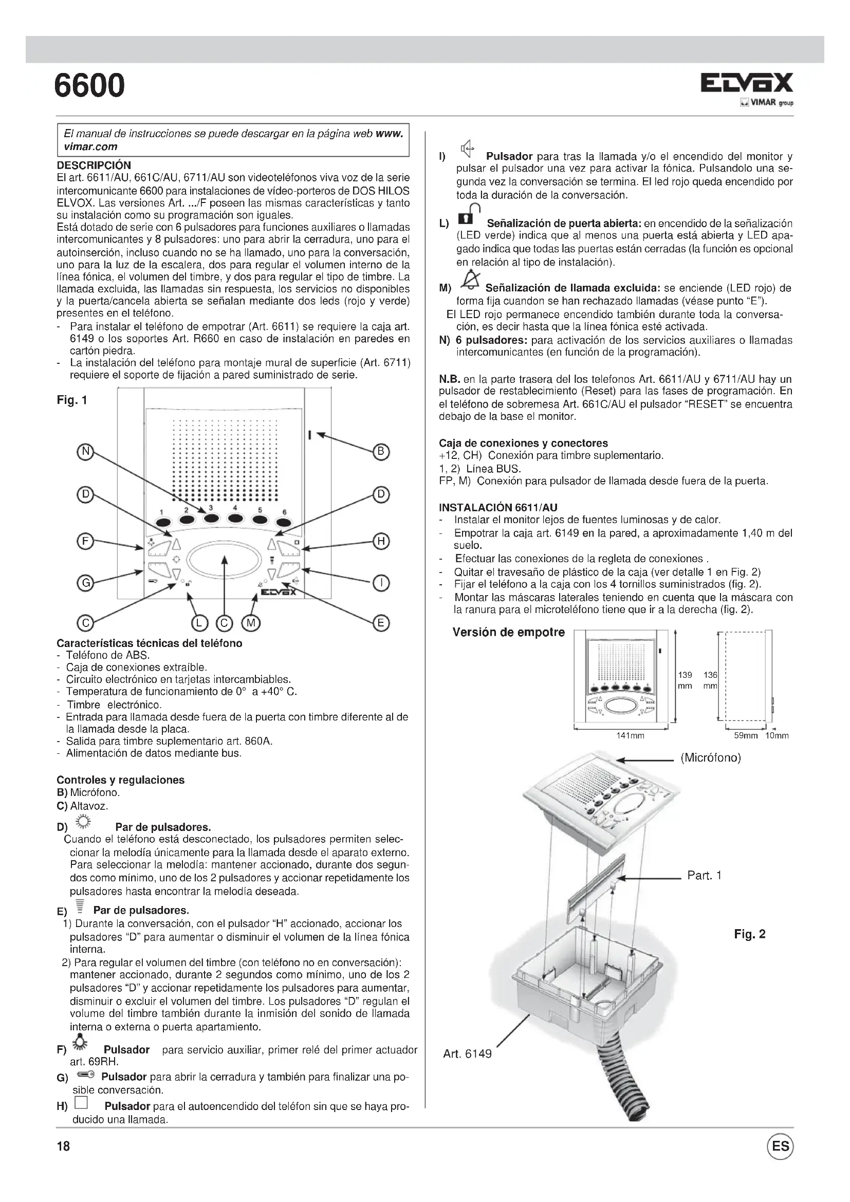 - Instalar el monitor lejos de fuentes luminosas y de calor. - Empotrar la caja art. 6149 en la pared, a aproximadamente 1,40 m del suelo. - Efectuar las conexiones de la regleta de conexiones . - Quitar el travesaño de plástico de la caja (ver detalle 1 en Fig. 2) - Fijar el teléfono a la caja con los 4 tornillos suministrados (fig. 2). - Montar las máscaras laterales teniendo en cuenta que la máscara con la ranura para el microteléfono tiene que ir a la derecha (fig. 2). Fig. 2 Versión de empotre (Micrófono) Art. 6149 Part. 1 DESCRIPCIÓN El art. 6611/AU, 661C/AU, 6711/AU son videoteléfonos viva voz de la serie intercomunicante 6600 para instalaciones de vídeo-porteros de DOS HILOS ELVOX. Las versiones Art. .../F poseen las mismas características y tanto su instalación como su programación son iguales. Está dotado de serie con 6 pulsadores para funciones auxiliares o llamadas intercomunicantes y 8 pulsadores: uno para abrir la cerradura, uno para el autoinserción, incluso cuando no se ha llamado, uno para la conversación, uno para la luz de la escalera, dos para regular el volumen interno de la línea fónica, el volumen del timbre, y dos para regular el tipo de timbre. La llamada excluida, las llamadas sin respuesta, los servicios no disponibles y la puerta/cancela abierta se señalan mediante dos leds (rojo y verde) presentes en el teléfono. - Para instalar el teléfono de empotrar (Art. 6611) se requiere la caja art. 6149 o los soportes Art. R660 en caso de instalación en paredes en cartón piedra. - La instalación del teléfono para montaje mural de superficie (Art. 6711) requiere el soporte de fijación a pared suministrado de serie. RESET Fig. 1
