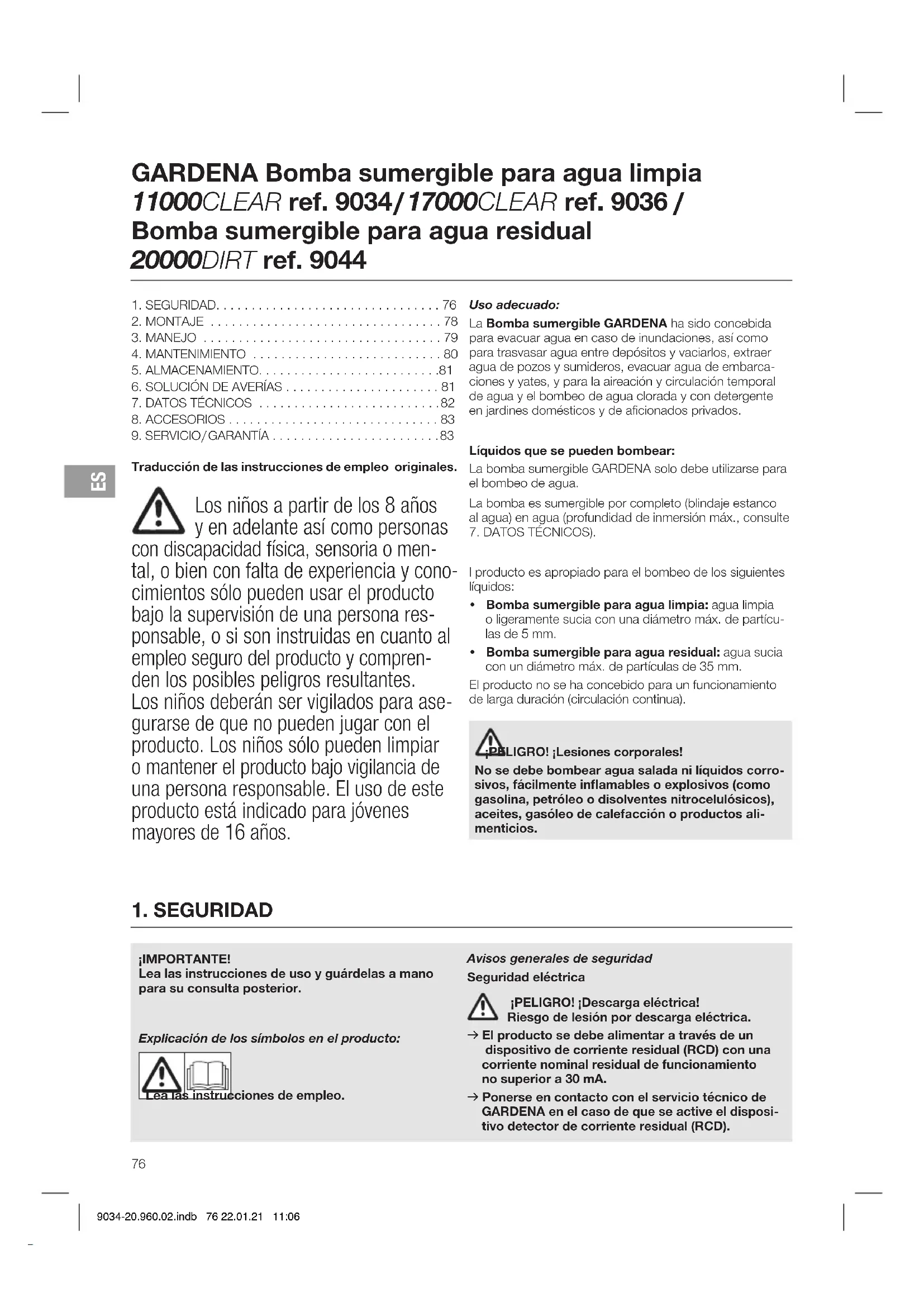 9034-20.960.02.indb 76 22.01.21 11:06GARDENA Bomba sumergible para agua limpia 11000CLEAR ref. 9034 / 17000CLEAR ref. 9036 / Bomba sumergible para agua residual 20000DIRT ref. 9044 ¡PELIGRO! ¡Riesgo de lesión! Riesgo de lesión por corriente eléctrica. v Desconecte el producto de la red eléctrica antes de realizar trabajos de mantenimiento o de susti- tuir componentes. La toma de corriente debe encontrarse dentro de su campo visual. Funcionamiento seguro La temperatura del agua no debe superar los 35 °C. Si se encuentran personas en el agua, no debe utilizarse la bomba. La presencia de suciedad en el líquido puede deberse a una fuga de lubricante. Mantener a las personas alejadas del agua. Operar la bomba solo con la pieza acodada. El extremo de la manguera debe quedar a una altura inferior a la altura de succión máxima. Interruptor diferencial Disyuntor térmico de seguridad: En caso de sobrecarga, el disyuntor térmico integrado para proteger el motor desconecta la bomba. Cuando el motor se ha enfriado suficientemente, la bomba vuelve aestar lista para el funcionamiento. Evacuación automática del aire Esta bomba está equipada con una válvula de purga que extrae posibles burbujas de aire que hayan quedado en la bomba. Por motivos funcionales es posible que salga una pequeña cantidad de agua por el lateral de la carcasa. Avisos adicionales de seguridad Seguridad eléctrica ¡PELIGRO! ¡Parada cardiaca! Este producto genera un campo electromagnético durante el funcionamiento. Este campo puede influir, bajo determinadas circunstancias, en el modo de funcionamiento de implantes médicos activos o pasivos. Con el fin de evitar el riesgo de situaciones que pudieran conllevar lesiones graves o incluso mortales, las personas que lleven un implante médi- co deberán consultar al médico y fabricante del implante antes de usar este pro ducto. Cable En el caso de utilizar cables de prolongación, se deben tener en cuenta las secciones transversales mínimas de la siguiente tabla: Tensión Longitud del cable Sección transversal 230 – 240 V / 50 Hz Hasta 20 m 1,5 mm