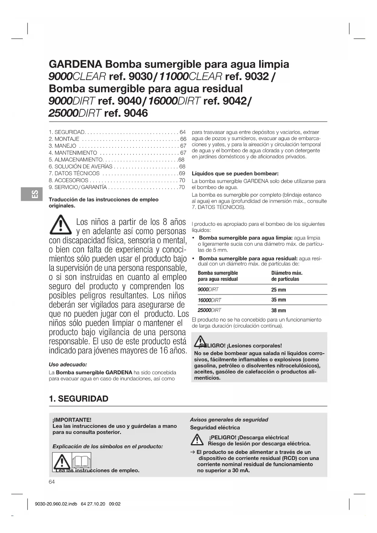 ¡IMPORTANTE! Lea las instrucciones de uso y guárdelas a mano para su consulta posterior. Explicación de los símbolos en el producto: Lea las instrucciones de empleo. Avisos generales de seguridad Seguridad eléctrica ¡PELIGRO! ¡Descarga eléctrica! Riesgo de lesión por descarga eléctrica. v El producto se debe alimentar a través de un dispositivo de corriente residual (RCD) con una corriente nominal residual de funcionamiento no superior a 30 mA. GARDENA Bomba sumergible para agua limpia 9000CLEAR ref. 9030 / 11000CLEAR ref. 9032 / Bomba sumergible para agua residual 9000DIRT ref. 9040 / 16000DIRT ref. 9042 / 25000DIRT ref. 9046