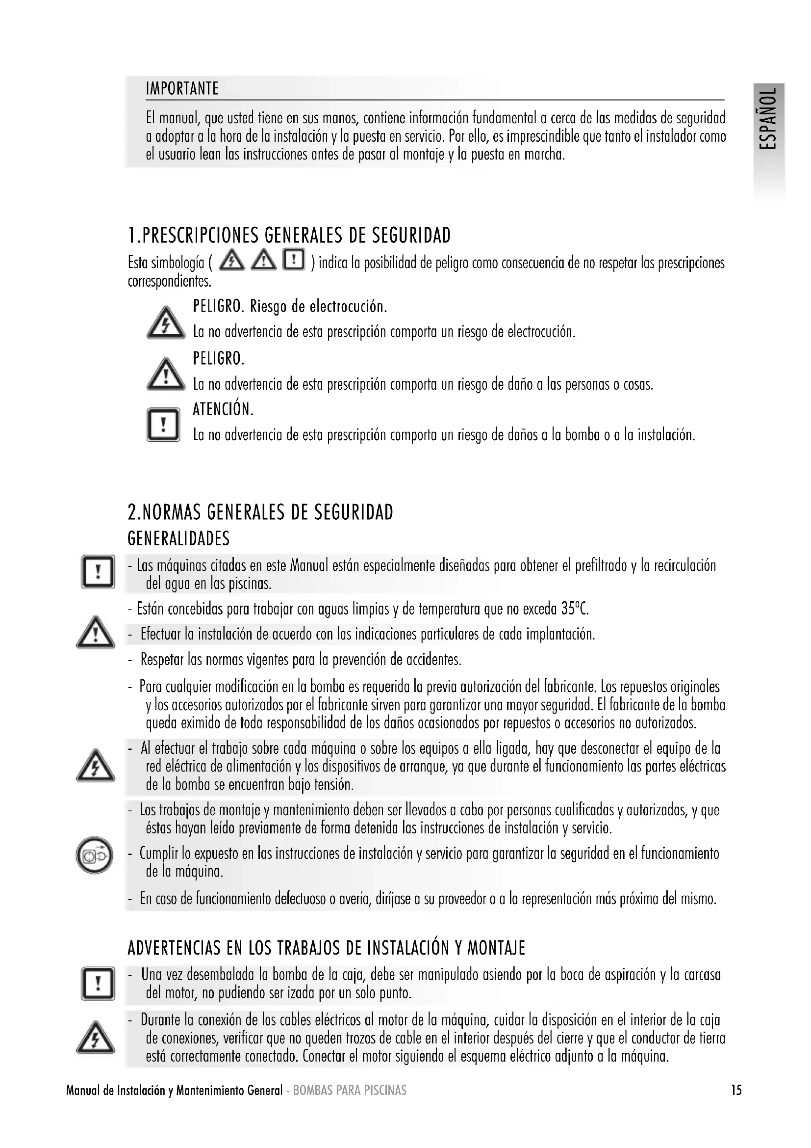 Manual de Instalación y Mantenimiento General - BOMBAS PARA PISCINAS 15 IMPORTANTE El manual, que usted tiene en sus manos, contiene información fundamental a cerca de las medidas de seguridad a adoptar a la hora de la instalación y la puesta en servicio. Por ello, es imprescindible que tanto el instalador como el usuario lean las instrucciones antes de pasar al montaje y la puesta en marcha.