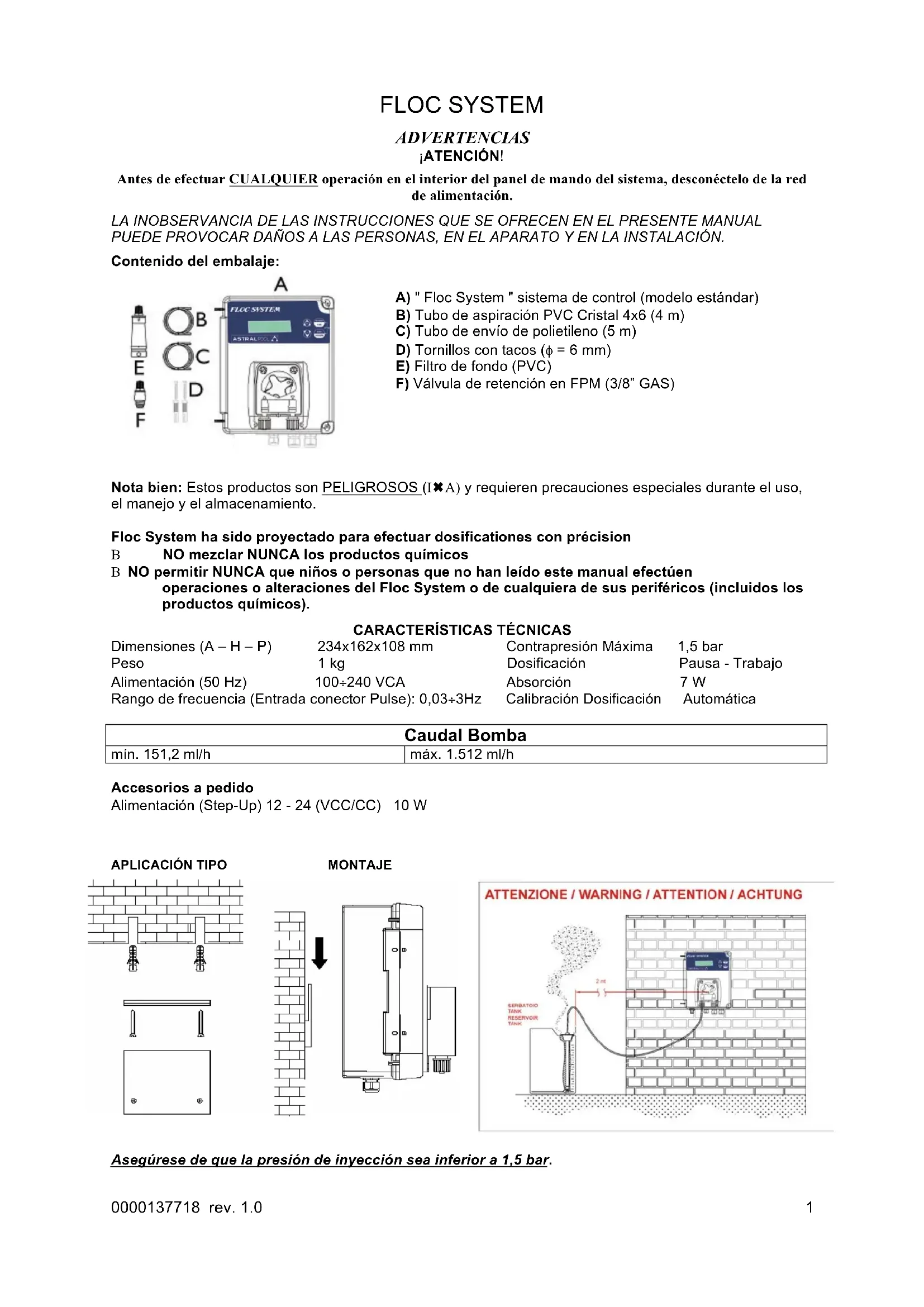 Nota bien: Estos productos son PELIGROSOS (I!A) y requieren precauciones especiales durante el uso, el manejo y el almacenamiento. Floc System ha sido proyectado para efectuar dosificationes con précision B NO mezclar NUNCA los productos químicos B NO permitir NUNCA que niños o personas que no han leído este manual efectúen operaciones o alteraciones del Floc System o de cualquiera de sus periféricos (incluidos los productos químicos).