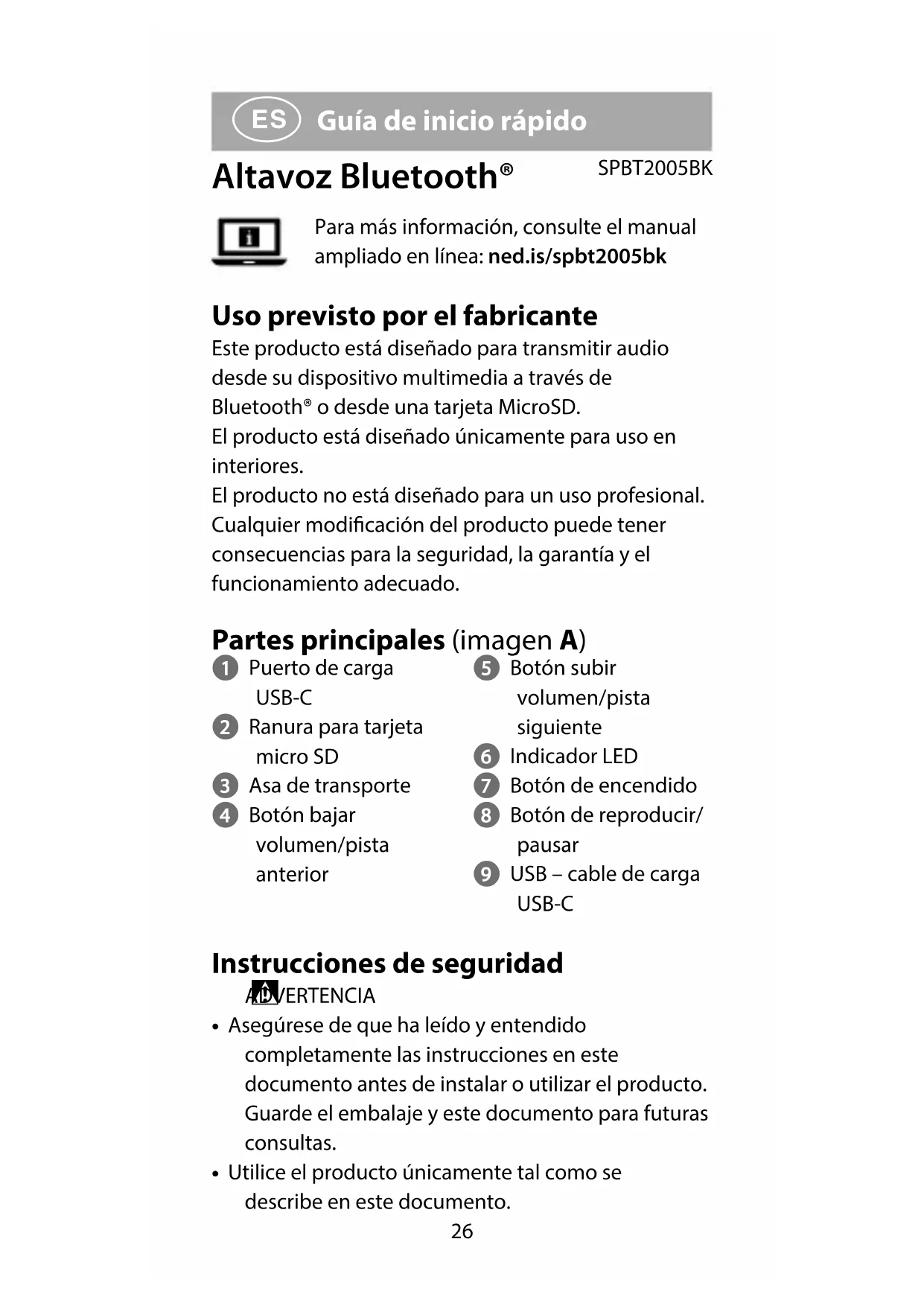 Guía de inicio rápido Altavoz Bluetooth® SPBT2005BKPara más información, consulte el manual ampliado en línea: ned.is/spbt2005bk Uso previsto por el fabricante Este producto está diseñado para transmitir audio desde su dispositivo multimedia a través de Bluetooth® o desde una tarjeta MicroSD.El producto está diseñado únicamente para uso en interiores.El producto no está diseñado para un uso profesional.Cualquier modicación del producto puede tener consecuencias para la seguridad, la garantía y el funcionamiento adecuado. Partes principales (imagen A) 1 Puerto de carga USB-C 2 Ranura para tarjeta micro SD 3 Asa de transporte 4 Botón bajar volumen/pista anterior 5 Botón subir volumen/pista siguiente 6 Indicador LED 7 Botón de encendido 8 Botón de reproducir/ pausar 9 USB – cable de carga USB-C Instrucciones de seguridad
