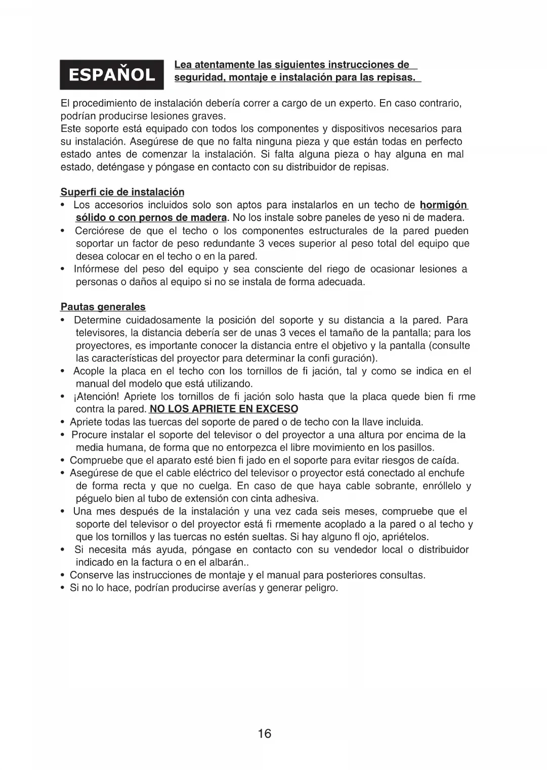 - Una mes después de la instalación y una vez cada seis meses, compruebe que el soporte del televisor o del proyector está fi rmemente acoplado a la pared o al techo y que los tornillos y las tuercas no estén sueltas. Si hay alguno fl ojo, apriételos.