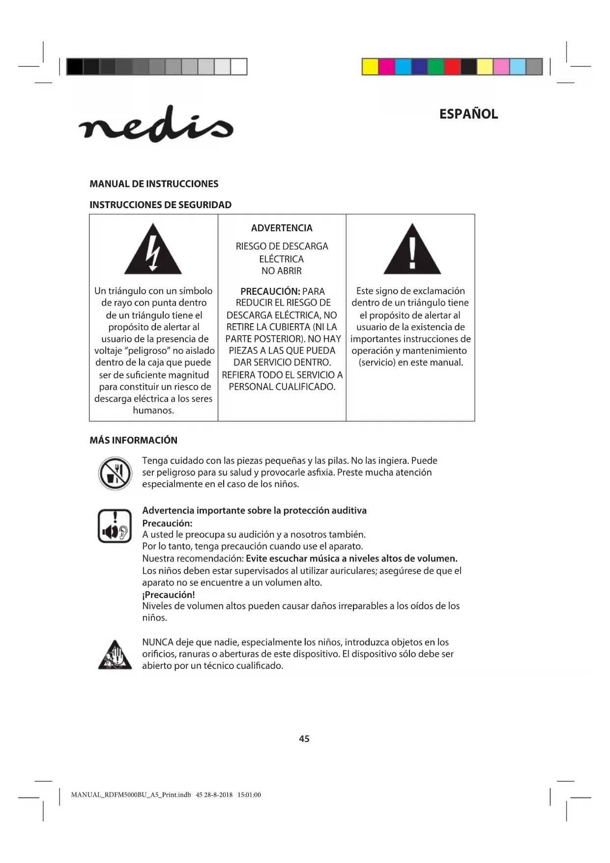 Tenga cuidado con las piezas pequeñas y las pilas. No las ingiera. Puede ser peligroso para su salud y provocarle asxia. Preste mucha atención especialmente en el caso de los niños. Advertencia importante sobre la protección auditiva Precaución: A usted le preocupa su audición y a nosotros también. Por lo tanto, tenga precaución cuando use el aparato. Nuestra recomendación: Evite escuchar música a niveles altos de volumen. Los niños deben estar supervisados al utilizar auriculares; asegúrese de que el aparato no se encuentre a un volumen alto. ¡Precaución! Niveles de volumen altos pueden causar daños irreparables a los oídos de los niños. NUNCA deje que nadie, especialmente los niños, introduzca objetos en los oricios, ranuras o aberturas de este dispositivo. El dispositivo sólo debe ser abierto por un técnico cualicado. MANUAL_RDFM5000BU_A5_Print.indb 45 28-8-2018 15:01:0046 ESPAÑOL Utilice este dispositivo únicamente para el propósito para el que está destinado. Este dispositivo sólo puede utilizarse en viviendas y locales comerciales. Por favor, conserve este manual de instrucciones para futuras consultas. Instrucciones sobre protección medioambiental No elimine este producto con la basura doméstica al nal de su vida útil; llévelo a un centro de recogida para reciclaje de aparatos eléctricos y electrónicos. Los símbolos de este producto, las instrucciones de uso o el embalaje le informarán sobre los métodos de eliminación. Los materiales son reciclables como se menciona en sus símbolos. Mediante el reciclaje u otras formas de reutilización de aparatos usados, usted está haciendo una importante contribución a la protección del medioambiente. Por favor, pregúntele a su administración local por el lugar autorizado para su eliminación. No obstruya la ventilación de este dispositivo. Asegúrese de que ninguna cortina, periódico, mueble ni otro tipo de objeto bloquee el sistema de ventilación del aparato. ¡El sistema de ventilación debe estar libre de objetos en todo momento! El sobrecalentamiento puede causar daños graves en el dispositivo y reducir su rendimiento y su tiempo de vida útil. Temperatura y calentamiento No exponga el aparato a la luz solar directa. Asegúrese de que el aparato no está sometido a fuentes directas de calor como calefactores o llamas. Asegúrese de que las ranuras de ventilación del aparato no estén cubiertas. Humedad y limpieza ¡Este aparato no es resistente al agua! No lo sumerja en el agua. No permita que entre en contacto con el agua. Si entra agua en el aparato pueden producirse graves daños. No utilice agentes limpiadores que contengan alcohol, amoníaco, benceno, ni agentes abrasivos, ya que podrían dañar el aparato. Para limpiarlo, utilice un paño suave húmedo. Reciclaje profesional No deseche las pilas ni el material de embalaje con la basura doméstica. Las pilas deben ser recogidas por el personal del centro recolector de baterías usadas. Separar los materiales de embalaje es benecioso para el medioambiente. MANUAL_RDFM5000BU_A5_Print.indb 46 28-8-2018 15:01:0147 ESPAÑOL