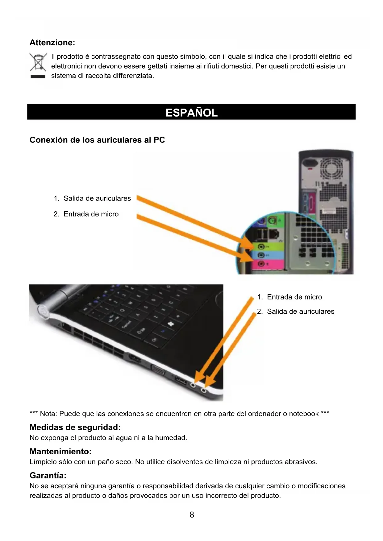 *** Nota: Puede que las conexiones se encuentren en otra parte del ordenador o notebook *** Medidas de seguridad: No exponga el producto al agua ni a la humedad. Mantenimiento: Límpielo sólo con un paño seco. No utilice disolventes de limpieza ni productos abrasivos. Garantía: No se aceptará ninguna garantía o responsabilidad derivada de cualquier cambio o modificaciones realizadas al producto o daños provocados por un uso incorrecto del producto.9 General: - Las ilustraciones y las especificaciones podrán sufrir cambios sin previo aviso. - Todas las marcas de logotipos y nombres de productos constituyen patentes o marcas registradas a nombre de sus titulares correspondientes, reconocidos como tal. - Este manual se ha redactado con sumo cuidado. Aún así, no se ofrece ninguna garantía. König Electronic no será responsable de los errores de este manual o de las consecuencias derivadas de los mismos. - Conserve este manual y el embalaje en caso de futura necesidad. Atención: Este producto está señalizado con este símbolo. Esto significa que los productos eléctricos y electrónicos usados no deberán mezclarse con los desechos domésticos generales. Existe un sistema de recogida individual para este tipo de productos.
