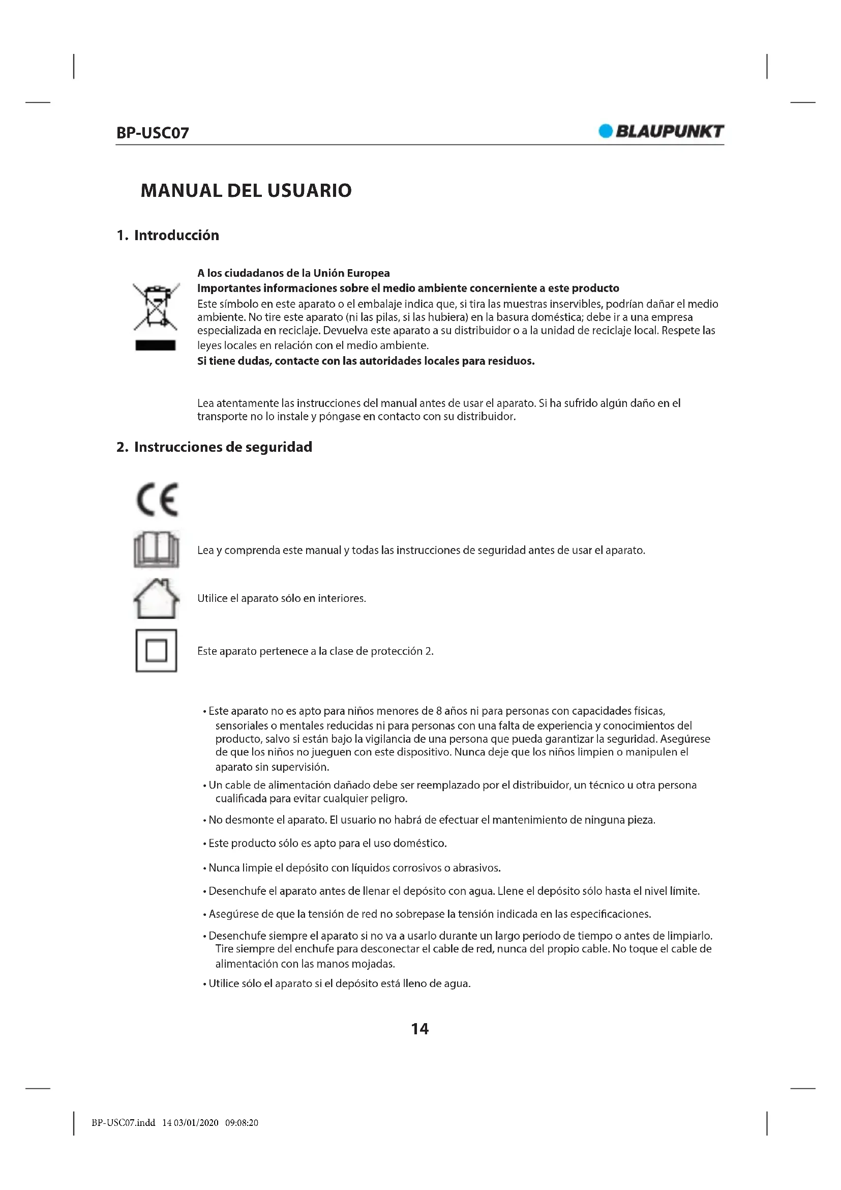 - Utilice sólo el aparato si el depósito está lleno de agua. BP-USC07.indd 14 03/01/2020 09:08:20BP-USC07