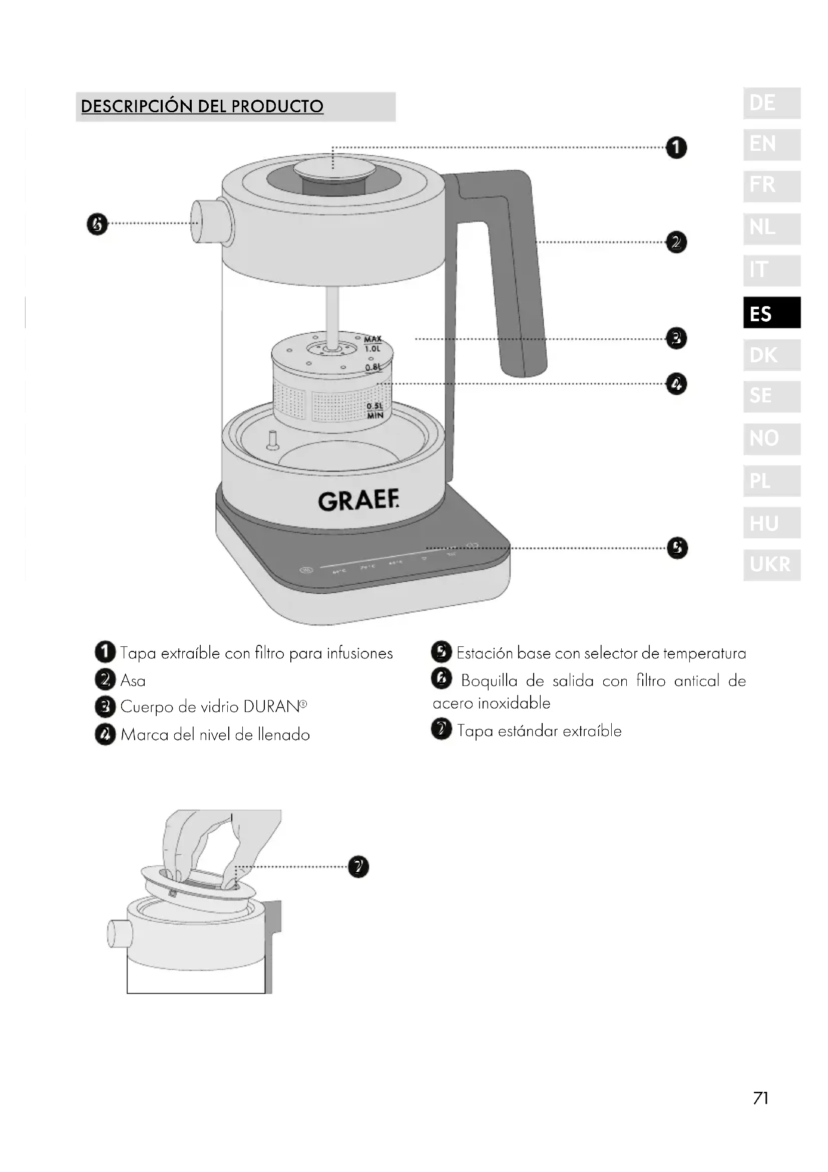 PRÓLOGO Estimado/a cliente: Ha hecho una buena elección al comprar este hervidor de agua eléctrico. Ha adquirido un producto de calidad reconocido. Le agradecemos su compra y le deseamos que disfrute con su nuevo hervidor de agua eléc- trico Graef. INFORMACIÓN ACERCA DEL PRESENTE MANUAL DE INSTRUCCIONES El presente manual de instrucciones forma parte del hervidor de agua (denominado de ahora en adelante, aparato) y aporta información esencial para la puesta en marcha, la seguridad, el uso previsto y la conservación del aparato. El manual de instrucciones debe guardarse siempre a mano, cerca del aparato. Debe ser leído y utilizado por la persona encargada de: ● La puesta en marcha, ● El manejo, ● la resolución de fallos; y/o ● Limpieza Conserve el presente manual de instrucciones y facilítelo junto con el aparato a las terceras personas que vayan a utilizarlo en el futuro. Este manual de instrucciones no puede tener en cuenta todos los aspectos imaginables. Para más información o en caso de problemas que no se traten en este manual de instrucciones o no se traten con suficiente detalle, diríjase al servicio de atención al cliente de Graef o a su distribuidor especializado. ADVERTENCIAS En el presente manual de instrucciones se utilizan las siguientes advertencias y palabras de advertencia: ADVERTENCIA Indica una situación potencialmente peligrosa. El incumplimiento de esta indicación puede producir lesiones de gravedad o provocar incluso la muerte. ATENCIÓN Indica una situación potencialmente peligrosa. En caso de incumplimiento de la indicación se pueden producir daños materiales. ¡IMPORTANTE! Indica consejos de uso y otras informaciones de especial importancia.73