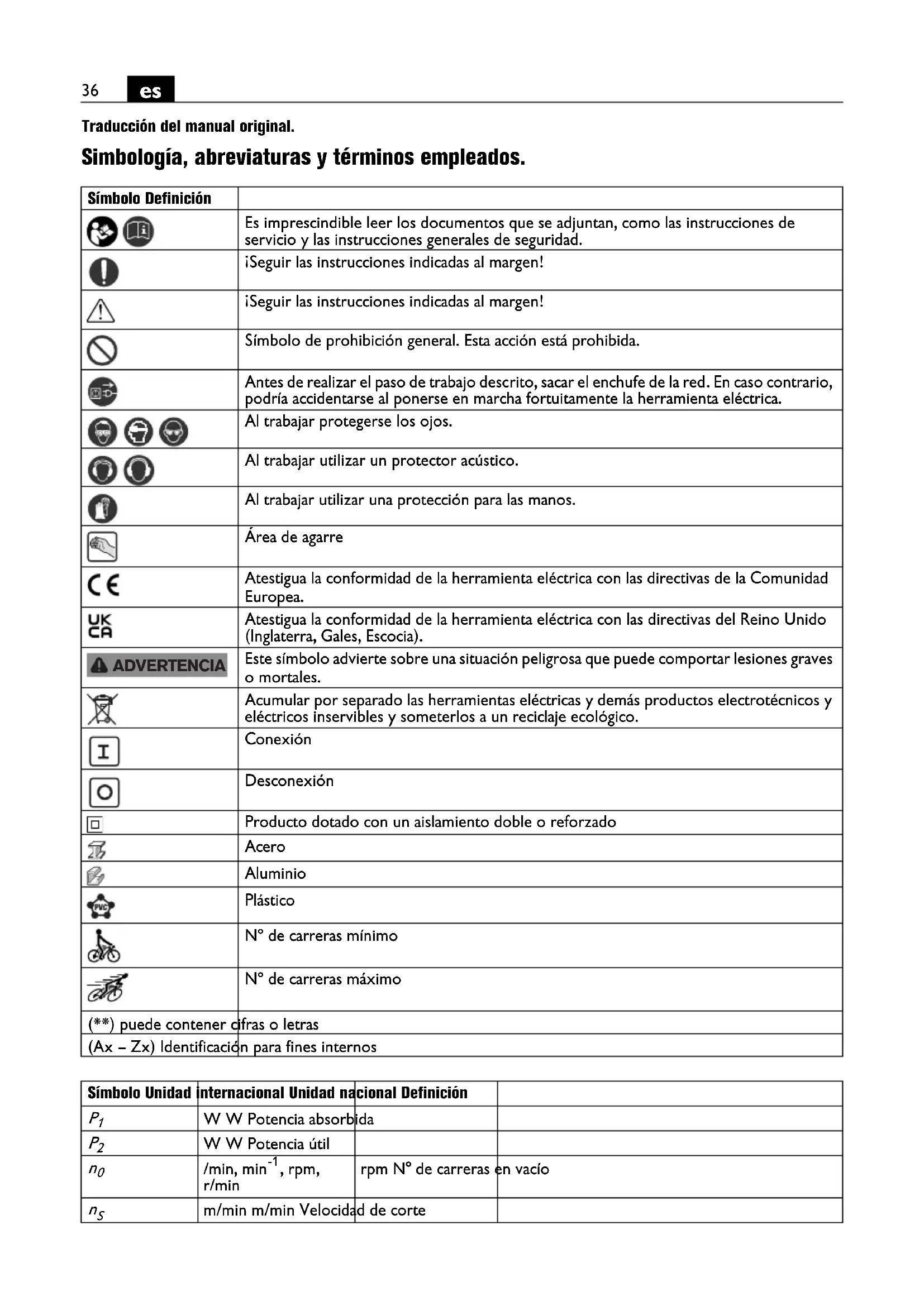 Traducción del manual original. Simbología, abreviaturas y términos empleados. Símbolo Definición Es imprescindible leer los documentos que se adjuntan, como las instrucciones de servicio y las instrucciones generales de seguridad. ¡Seguir las instrucciones indicadas al margen! ¡Seguir las instrucciones indicadas al margen! Símbolo de prohibición general. Esta acción está prohibida. Antes de realizar el paso de trabajo descrito, sacar el enchufe de la red. En caso contrario, podría accidentarse al ponerse en marcha fortuitamente la herramienta eléctrica. Al trabajar protegerse los ojos. Al trabajar utilizar un protector acústico. Al trabajar utilizar una protección para las manos. Área de agarre Atestigua la conformidad de la herramienta eléctrica con las directivas de la Comunidad Europea. Atestigua la conformidad de la herramienta eléctrica con las directivas del Reino Unido (Inglaterra, Gales, Escocia). Este símbolo advierte sobre una situación peligrosa que puede comportar lesiones graves o mortales. Acumular por separado las herramientas eléctricas y demás productos electrotécnicos y eléctricos inservibles y someterlos a un reciclaje ecológico. Conexión Desconexión Producto dotado con un aislamiento doble o reforzado Acero Aluminio Plástico Nº de carreras mínimo Nº de carreras máximo (**) puede contener cifras o letras (Ax – Zx) Identificación para fines internos ADVERTENCIA Símbolo Unidad internacional Unidad nacional Definición