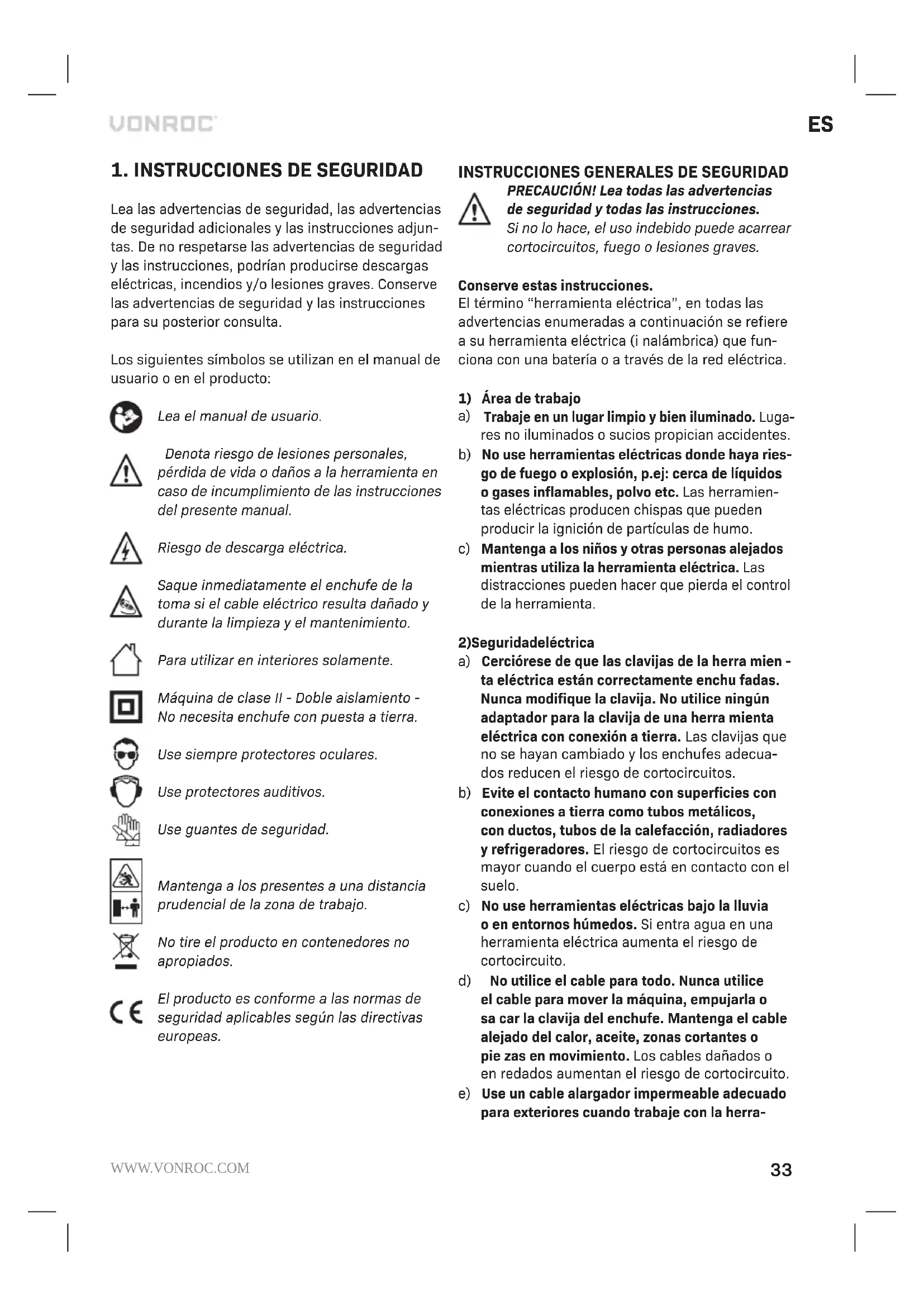 Lea las advertencias de seguridad, las advertencias de seguridad adicionales y las instrucciones adjun- tas. De no respetarse las advertencias de seguridad y las instrucciones, podrían producirse descargas eléctricas, incendios y/o lesiones graves. Conserve las advertencias de seguridad y las instrucciones para su posterior consulta. Los siguientes símbolos se utilizan en el manual de usuario o en el producto: Lea el manual de usuario. Denota riesgo de lesiones personales, pérdida de vida o daños a la herramienta en caso de incumplimiento de las instrucciones del presente manual. Riesgo de descarga eléctrica. Saque inmediatamente el enchufe de la toma si el cable eléctrico resulta dañado y durante la limpieza y el mantenimiento. Para utilizar en interiores solamente. Máquina de clase II - Doble aislamiento - No necesita enchufe con puesta a tierra. Use siempre protectores oculares. Use protectores auditivos. Use guantes de seguridad. Mantenga a los presentes a una distancia prudencial de la zona de trabajo. No tire el producto en contenedores no apropiados. El producto es conforme a las normas de seguridad aplicables según las directivas europeas.