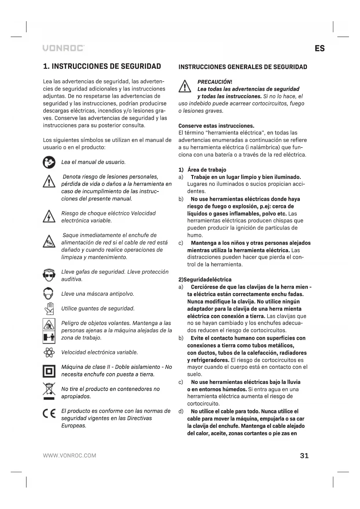 Lea las advertencias de seguridad, las adverten- cies de seguridad adicionales y las instrucciones adjuntas. De no respetarse las advertencias de seguridad y las instrucciones, podrían producirse descargas eléctricas, incendios y/o lesiones gra- ves. Conserve las advertencias de seguridad y las instrucciones para su posterior consulta. Los siguientes símbolos se utilizan en el manual de usuario o en el producto: Lea el manual de usuario. Denota riesgo de lesiones personales, pérdida de vida o daños a la herramienta en caso de incumplimiento de las instruc- ciones del presente manual. Riesgo de choque eléctrico Velocidad electrónica variable. Saque inmediatamente el enchufe de alimentación de red si el cable de red está dañado y cuando realice operaciones de limpieza y mantenimiento. Lleve gafas de seguridad. Lleve protección auditiva. Lleve una máscara antipolvo. Utilice guantes de seguridad. Peligro de objetos volantes. Mantenga a las personas ajenas a la máquina alejadas de la zona de trabajo. Velocidad electrónica variable. Máquina de clase II - Doble aislamiento - No necesita enchufe con puesta a tierra. No tire el producto en contenedores no apropiados. El producto es conforme con las normas de seguridad vigentes en las Directivas Europeas.