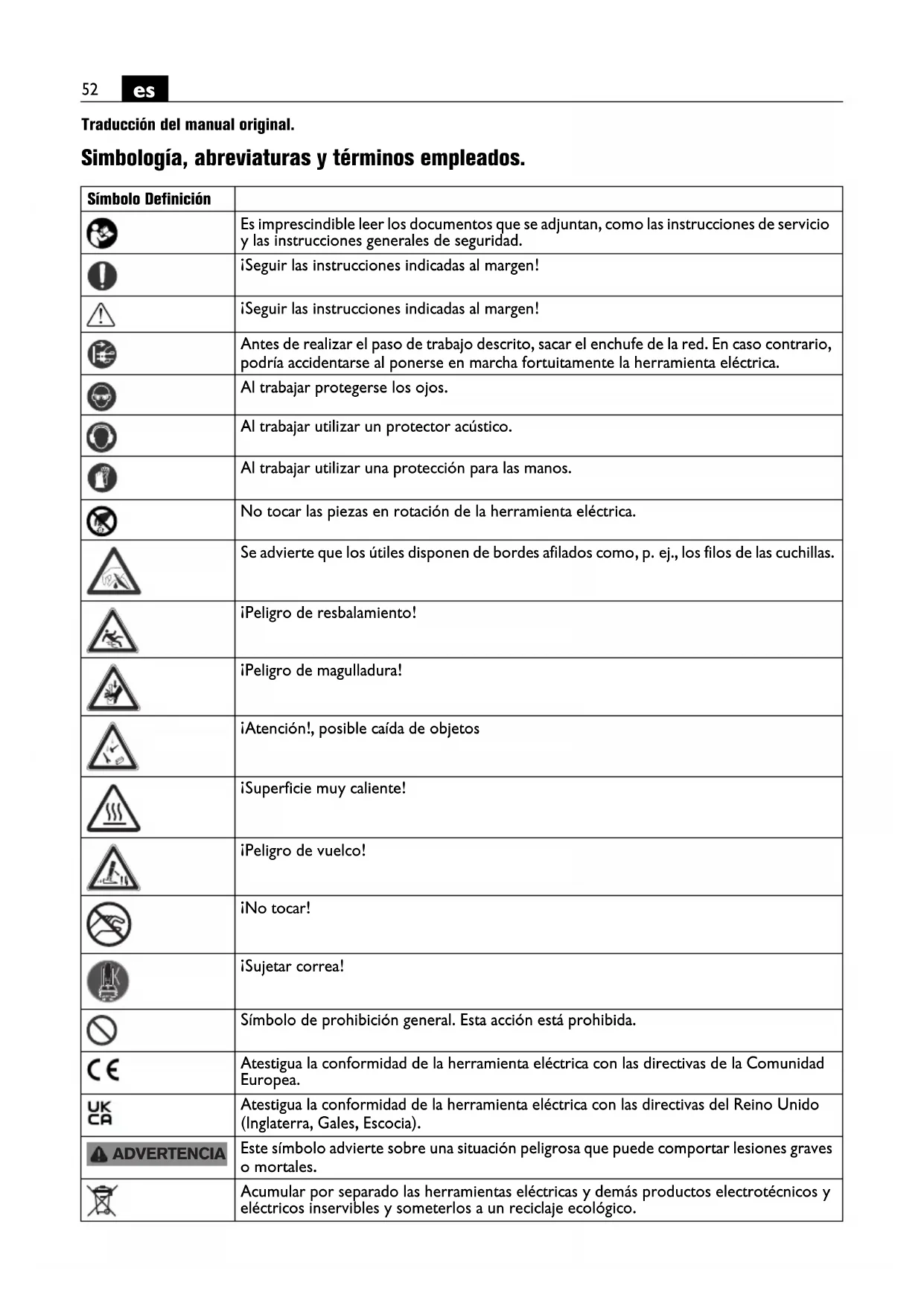Traducción del manual original. Simbología, abreviaturas y términos empleados. Símbolo Definición Es imprescindible leer los documentos que se adjuntan, como las instrucciones de servicio y las instrucciones generales de seguridad. ¡Seguir las instrucciones indicadas al margen! ¡Seguir las instrucciones indicadas al margen! Antes de realizar el paso de trabajo descrito, sacar el enchufe de la red. En caso contrario, podría accidentarse al ponerse en marcha fortuitamente la herramienta eléctrica. Al trabajar protegerse los ojos. Al trabajar utilizar un protector acústico. Al trabajar utilizar una protección para las manos. No tocar las piezas en rotación de la herramienta eléctrica. Se advierte que los útiles disponen de bordes afilados como, p. ej., los filos de las cuchillas. ¡Peligro de resbalamiento! ¡Peligro de magulladura! ¡Atención!, posible caída de objetos ¡Superficie muy caliente! ¡Peligro de vuelco! ¡No tocar! ¡Sujetar correa! Símbolo de prohibición general. Esta acción está prohibida. Atestigua la conformidad de la herramienta eléctrica con las directivas de la Comunidad Europea. Atestigua la conformidad de la herramienta eléctrica con las directivas del Reino Unido (Inglaterra, Gales, Escocia). Este símbolo advierte sobre una situación peligrosa que puede comportar lesiones graves o mortales. Acumular por separado las herramientas eléctricas y demás productos electrotécnicos y eléctricos inservibles y someterlos a un reciclaje ecológico. ADVERTENCIA53