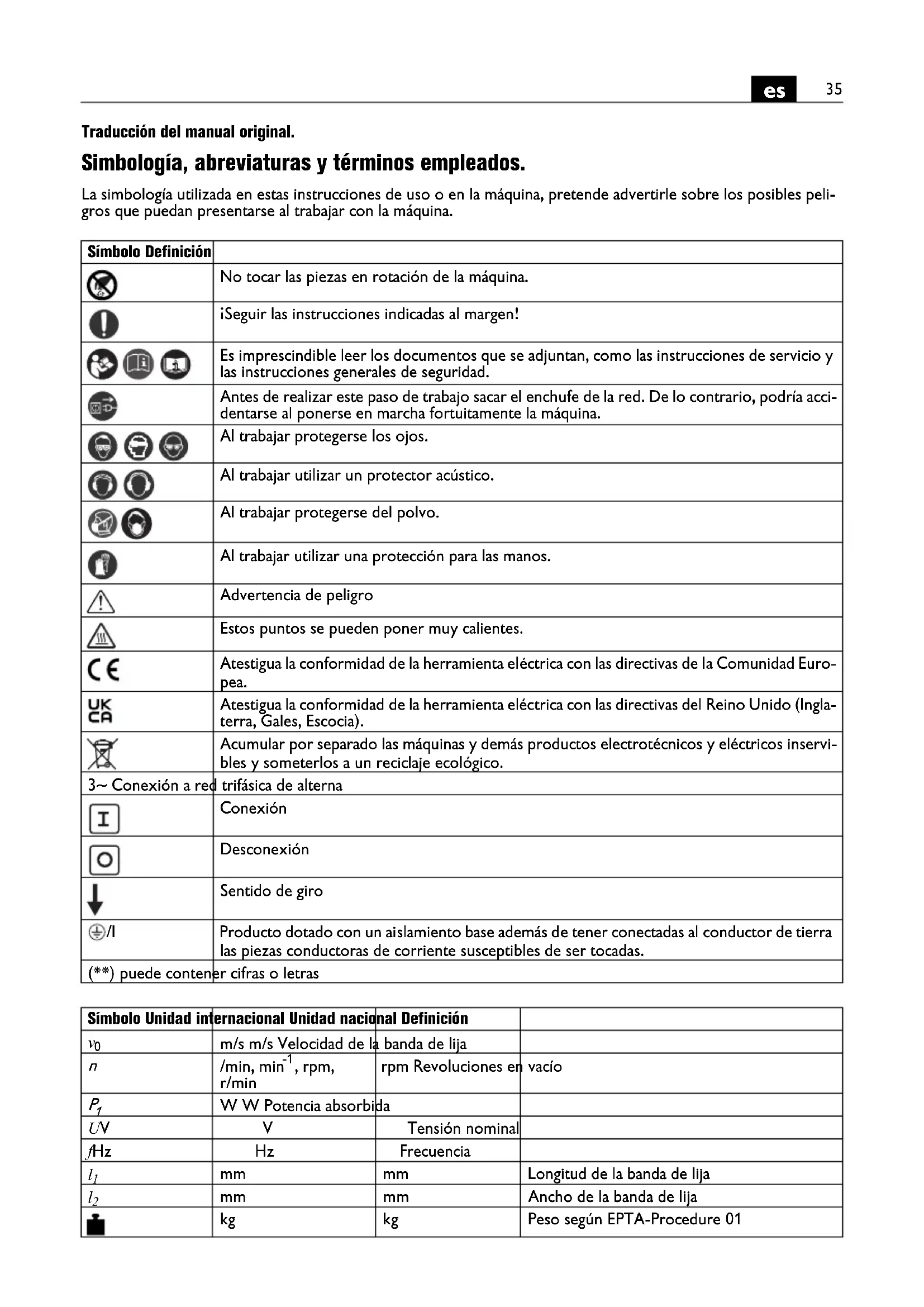 Traducción del manual original. Simbología, abreviaturas y términos empleados. La simbología utilizada en estas instrucciones de uso o en la máquina, pretende advertirle sobre los posibles peli- gros que puedan presentarse al trabajar con la máquina. Símbolo Definición No tocar las piezas en rotación de la máquina. ¡Seguir las instrucciones indicadas al margen! Es imprescindible leer los documentos que se adjuntan, como las instrucciones de servicio y las instrucciones generales de seguridad. Antes de realizar este paso de trabajo sacar el enchufe de la red. De lo contrario, podría acci- dentarse al ponerse en marcha fortuitamente la máquina. Al trabajar protegerse los ojos. Al trabajar utilizar un protector acústico. Al trabajar protegerse del polvo. Al trabajar utilizar una protección para las manos. Advertencia de peligro Estos puntos se pueden poner muy calientes. Atestigua la conformidad de la herramienta eléctrica con las directivas de la Comunidad Euro- pea. Atestigua la conformidad de la herramienta eléctrica con las directivas del Reino Unido (Ingla- terra, Gales, Escocia). Acumular por separado las máquinas y demás productos electrotécnicos y eléctricos inservi- bles y someterlos a un reciclaje ecológico. 3~ Conexión a red trifásica de alterna Conexión Desconexión Sentido de giro /I Producto dotado con un aislamiento base además de tener conectadas al conductor de tierra las piezas conductoras de corriente susceptibles de ser tocadas. (**) puede contener cifras o letras Símbolo Unidad internacional Unidad nacional Definición