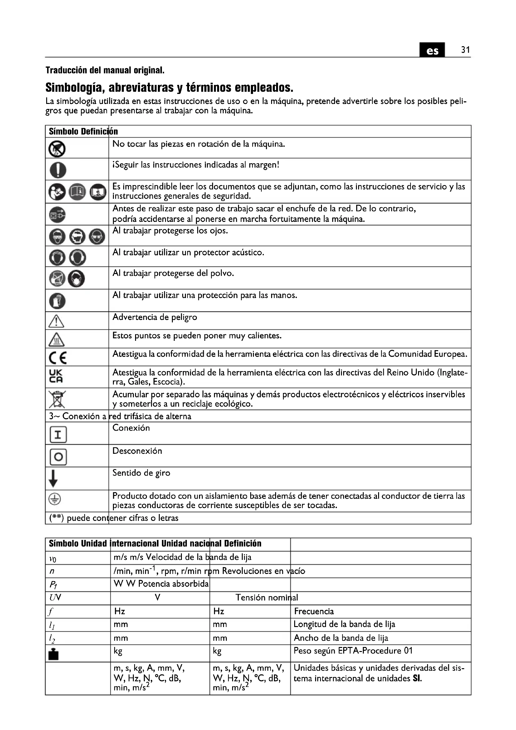 Traducción del manual original. Simbología, abreviaturas y términos empleados. La simbología utilizada en estas instrucciones de uso o en la máquina, pretende advertirle sobre los posibles peli- gros que puedan presentarse al trabajar con la máquina. Símbolo Definición No tocar las piezas en rotación de la máquina. ¡Seguir las instrucciones indicadas al margen! Es imprescindible leer los documentos que se adjuntan, como las instrucciones de servicio y las instrucciones generales de seguridad. Antes de realizar este paso de trabajo sacar el enchufe de la red. De lo contrario, podría accidentarse al ponerse en marcha fortuitamente la máquina. Al trabajar protegerse los ojos. Al trabajar utilizar un protector acústico. Al trabajar protegerse del polvo. Al trabajar utilizar una protección para las manos. Advertencia de peligro Estos puntos se pueden poner muy calientes. Atestigua la conformidad de la herramienta eléctrica con las directivas de la Comunidad Europea. Atestigua la conformidad de la herramienta eléctrica con las directivas del Reino Unido (Inglate- rra, Gales, Escocia). Acumular por separado las máquinas y demás productos electrotécnicos y eléctricos inservibles y someterlos a un reciclaje ecológico. 3~ Conexión a red trifásica de alterna Conexión Desconexión Sentido de giro Producto dotado con un aislamiento base además de tener conectadas al conductor de tierra las piezas conductoras de corriente susceptibles de ser tocadas. (**) puede contener cifras o letras Símbolo Unidad internacional Unidad nacional Definición