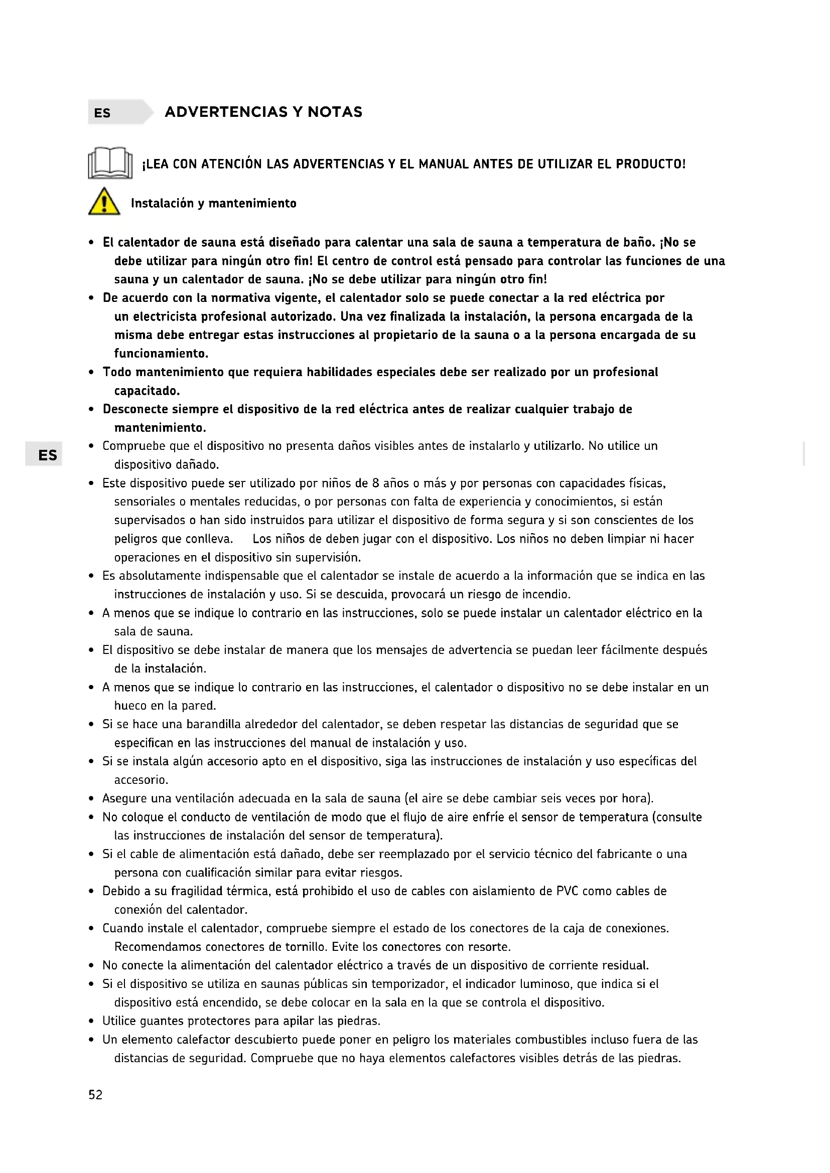 CONTENIDO Estas instrucciones de instalación y uso están destinadas al propietario o a la perso-na a cargo de la sauna, así como al electricista en-cargado de la instalación eléctrica del calentador. Después de completar la instalación, la persona a cargo de la misma debe entregar estas instrucciones al propietario de la sauna o a la persona encargada de su funcionamiento.