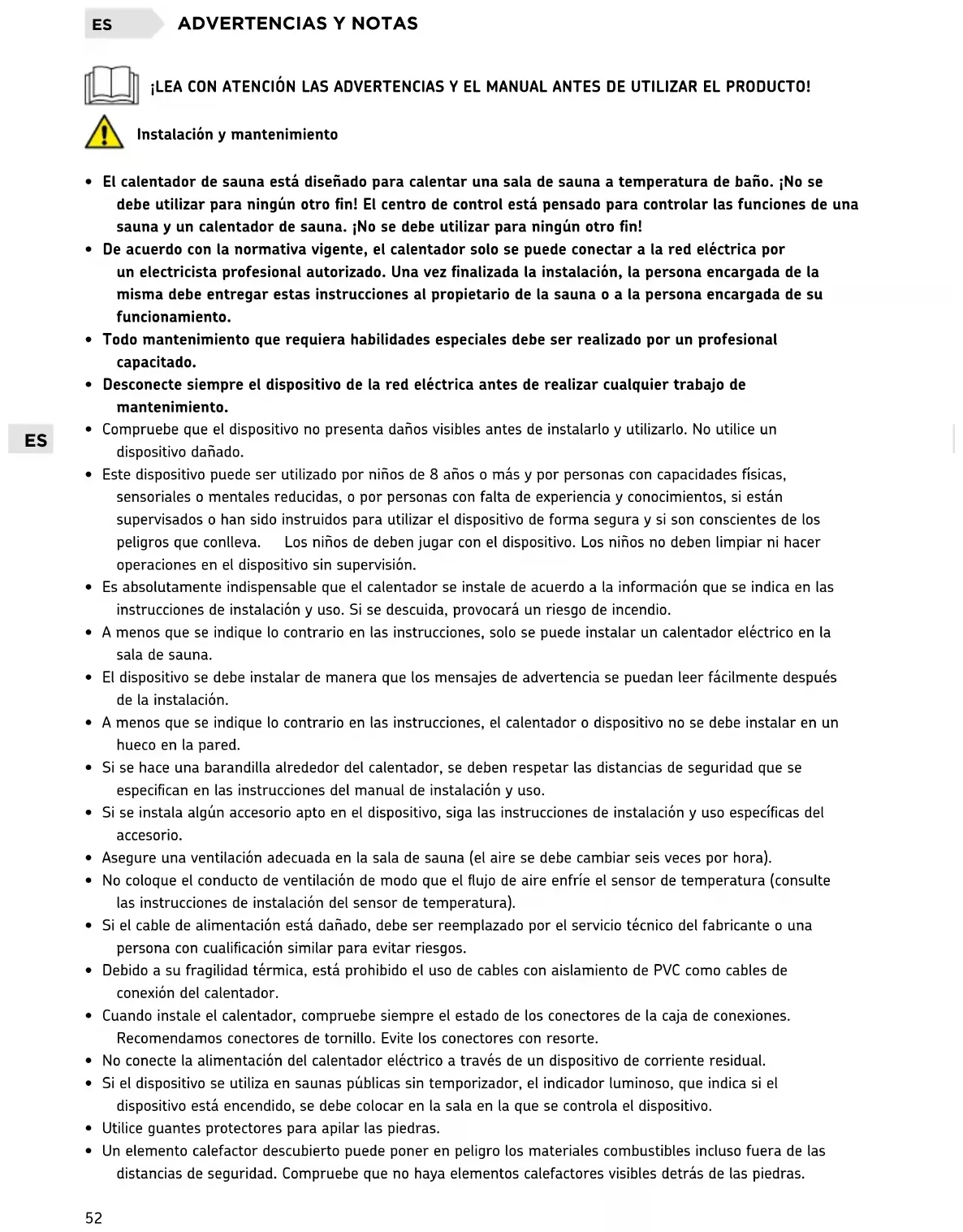 CONTENIDO Estas instrucciones de instalación y uso están destinadas al propietario o a la perso-na a cargo de la sauna, así como al electricista en-cargado de la instalación eléctrica del calentador. Después de completar la instalación, la persona a cargo de la misma debe entregar estas instrucciones al propietario de la sauna o a la persona encargada de su funcionamiento.