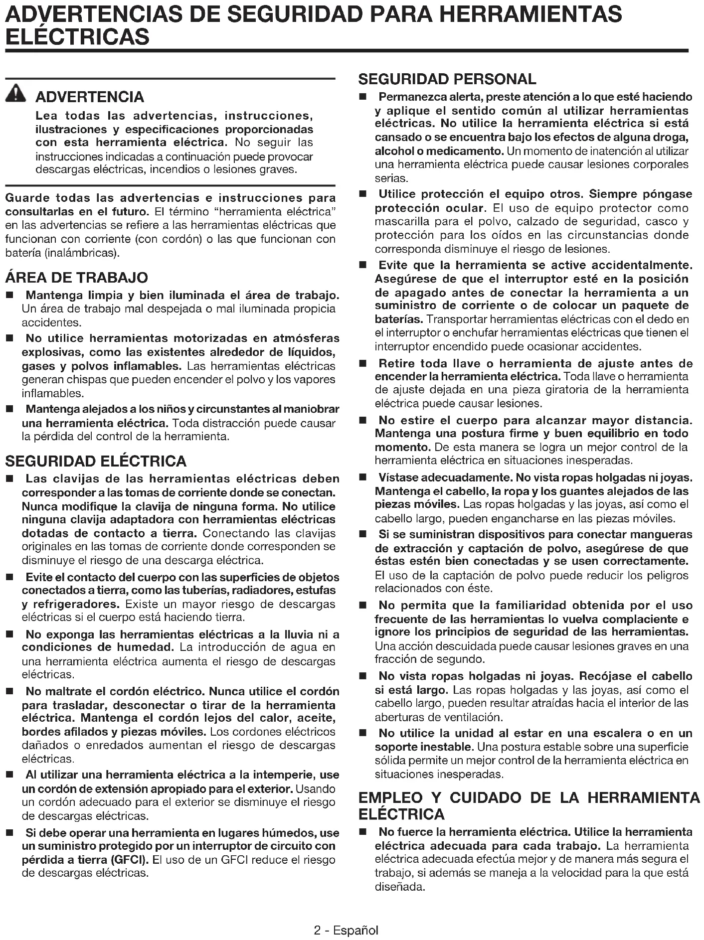 ELÉCTRICAS ADVERTENCIA Lea todas las advertencias, instrucciones, ilustraciones y especificaciones proporcionadas con esta herramienta eléctrica. No seguir las instrucciones indicadas a continuación puede provocar descargas eléctricas, incendios o lesiones graves. Guarde todas las advertencias e instrucciones para consultarlas en el futuro. El término “herramienta eléctrica” en las advertencias se refiere a las herramientas eléctricas que funcionan con corriente (con cordón) o las que funcionan con batería (inalámbricas).