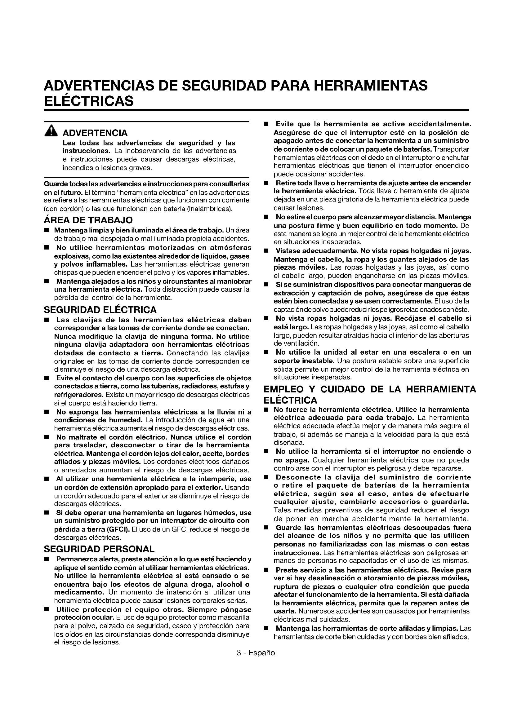 ELÉCTRICAS tienen menos probabilidad de atascarse en la pieza de trabajo y son más fáciles de controlar. Utilice la herramienta eléctrica, los accesorios y brocas, hojas y cuchillas de corte, ruedas de esmeril, etc. de conformidad con estas instrucciones, tomando en cuenta las condiciones de trabajo y la tarea por realizar. Si se utiliza la herramienta eléctrica para operaciones diferentes de las indicadas podría originar una situación peligrosa. SERVICIO Permita que un técnico de reparación calificado preste servicio a la herramienta eléctrica, y sólo con piezas de repuesto idénticas. De esta manera se mantiene la seguridad de la herramienta eléctrica. Al dar servicio a una herramienta eléctrica, sólo utilice piezas de repuesto idénticas. Siga las instrucciones señaladas en la sección Mantenimiento de este manual. El empleo de piezas no autorizadas o el incumplimiento de las instrucciones de mantenimiento puede significar un riesgo de descarga eléctrica o de lesiones.de descarga eléctrica o de lesiones.