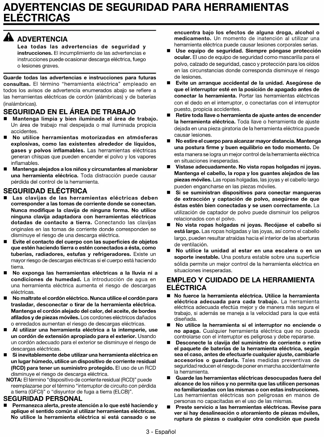 ELÉCTRICAS ADVERTENCIA Lea todas las advertencias de seguridad y instrucciones. El incumplimiento de las advertencias e instrucciones puede ocasionar descarga eléctrica, fuego o lesiones graves. Guarde todas las advertencias e instrucciones para futuras consultas. El término “herramienta eléctrica” empleado en todos los avisos de advertencia enumerados abajo se refiere a las herramientas eléctricas de cordón (alámbricas) y de baterías (inalámbricas). Seguridad en el área de trabajo Mantenga limpia y bien iluminada el área de trabajo. Un área de trabajo mal despejada o mal iluminada propicia accidentes. No utilice herramientas motorizadas en atmósferas explosivas, como las existentes alrededor de líquidos, gases y polvos inflamables. Las herramientas eléctricas generan chispas que pueden encender el polvo y los vapores inflamables. Mantenga alejados a los niños y circunstantes al maniobrar una herramienta eléctrica. Toda distracción puede causar pérdida del control de la herramienta.