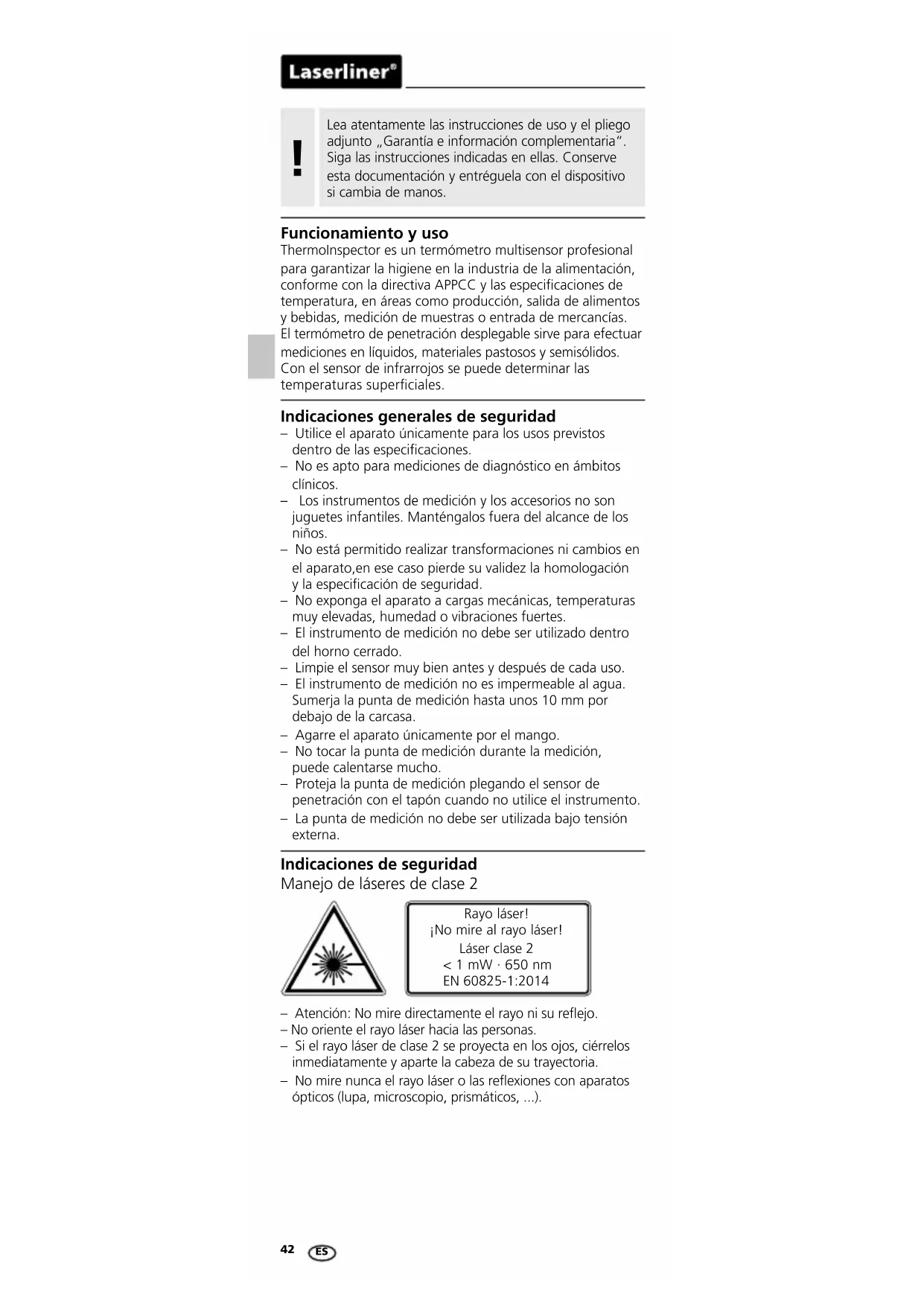 Funcionamiento y uso ThermoInspector es un termómetro multisensor profesional para garantizar la higiene en la industria de la alimentación, conforme con la directiva APPCC y las especicaciones de temperatura, en áreas como producción, salida de alimentos y bebidas, medición de muestras o entrada de mercancías. El termómetro de penetración desplegable sirve para efectuar mediciones en líquidos, materiales pastosos y semisólidos. Con el sensor de infrarrojos se puede determinar las temperaturas superciales. Indicaciones generales de seguridad – Utilice el aparato únicamente para los usos previstos dentro de las especicaciones. – No es apto para mediciones de diagnóstico en ámbitos clínicos. – Los instrumentos de medición y los accesorios no son juguetes infantiles. Manténgalos fuera del alcance de los niños. – No está permitido realizar transformaciones ni cambios en el aparato,en ese caso pierde su validez la homologación y la especicación de seguridad. – No exponga el aparato a cargas mecánicas, temperaturas muy elevadas, humedad o vibraciones fuertes. – El instrumento de medición no debe ser utilizado dentro del horno cerrado. – Limpie el sensor muy bien antes y después de cada uso. – El instrumento de medición no es impermeable al agua. Sumerja la punta de medición hasta unos 10 mm por debajo de la carcasa. – Agarre el aparato únicamente por el mango. – No tocar la punta de medición durante la medición, puede calentarse mucho. – Proteja la punta de medición plegando el sensor de penetración con el tapón cuando no utilice el instrumento. – La punta de medición no debe ser utilizada bajo tensión externa. Indicaciones de seguridad Manejo de láseres de clase 2 Rayo láser! ¡No mire al rayo láser! Láser clase 2 < 1 mW · 650 nm EN 60825-1:2014 – Atención: No mire directamente el rayo ni su reejo. – No oriente el rayo láser hacia las personas. – Si el rayo láser de clase 2 se proyecta en los ojos, ciérrelos inmediatamente y aparte la cabeza de su trayectoria. – No mire nunca el rayo láser o las reexiones con aparatos ópticos (lupa, microscopio, prismáticos, ...).ThermoInspector
