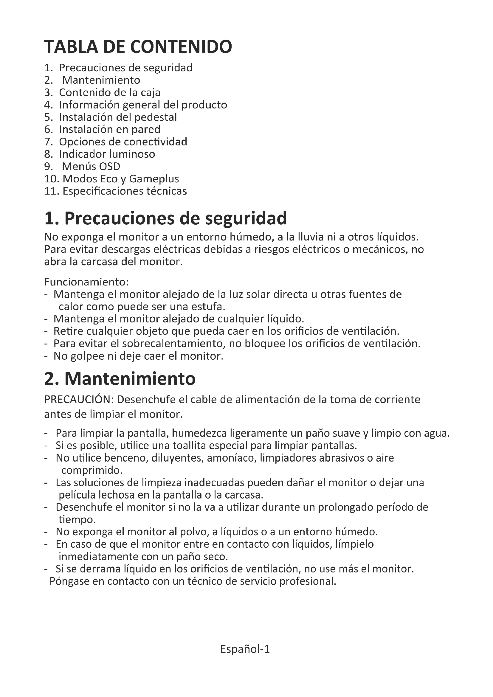 - Resalte la función que desee y, a connuación, presione M para entrar en el submenú. - Presione▲ ( ) o ( ) para navegar por los submenús y, a connuación, presione M para resaltar la función deseada. - Presione ▲ ( ) o ( ) para resaltar una opción y, a connuación, presione M para confirmar la configuración y salir de la pantalla actual. - Presione E ( ) para salir de la pantalla actual. El menú de visualización en pantalla (OSD) se puede usar para ajustar la configuración del monitor y aparece en la pantalla después de encender el monitor y presionar el botón M. Cuando use el monitor por primera vez, la configuración se ajustará automácamente a la configuración ópma de acuerdo con la configuración y las partes de su PC, etc.9.1 — Funciones de los menús OSD Español-9 Menú principal Submenú Opciones Descripción Fuente de entrada DP 1, DP 2 HDMI 1, HDMI 2 NINGUNA NINGUNA Permite cambiar a la entrada de señal DP Permite cambiar a la entrada de señal HDMI Brillo/ Contraste Brillo 0~100 Permite ajustar el brillo de la pantalla Contraste 0~100 Permite ajustar el contraste de la pantalla DCR Permite acvar la función DCR Apagar Acvado Permite desacvar la función DCR Configuración del color Gamma Permite establecer el complemento Gamma1,8 2,0 2,6 Modo de imagen Estándar, Foto, Película, Juego FPS, RTS, Permite establecer el modo visual de acuerdo con la acvidad Temperatura color Cálida, Fría, Usuario Permite seleccionar la temperatura de color Permite establecer nivel de filtrado de luz azul Low Blue Light 0~100 Color 0~100 Permite ajustar los niveles de maz Saturación de color 0~100 Permite ajustar los niveles de la saturación Ajuste de calidad de imagen Definición 0~100 Permite establecer la nidez de la pantalla Tiempo de respuesta Desacvada, Alta, Media, Baja Permite ajustar el empo de respuesta Reducción de ruido Super resolución Desacvada, Alta, Media, Baja Desacvada, Alta, Media, Baja Permite reducir la interferencia del ruido de la imagen causado por la interferencia de la fuente de señal Control de luminancia dinámico Acvado, Apagar Permite compensar la pantalla de escala de grises y fortalecer la expresión de la escala de grises Ajuste de Pantalla Relación de aspecto LedMode Pantalla completa, 4:3, 1:1, Auto Normal, Apagar, Flicker Permite seleccionar la relación de aspecto en pantalla Permite ajustar la iluminación LED de la cubierta posterior. Ajuste de audio Silencio Acvado, Apagar Permite acvar y desacvar el modo de silencio Volumen 0-100 Permite ajustar el volumen de audio Fuente de audio HDMI 1, HDM 2, DP 1, DP 2 Permite seleccionar la entrada de señal de audio a través de HDMI o DP 2,4 2,2 Cuando la resolución de la pantalla es baja, esta función se puede acvar para mejorar la resolución de la imagenEspañol-10 Menú principal Submenú Opciones Descripción Ajuste de mul-ventanas mul-ventanas Apagar, Modo PIP, Ven2PBP Permite seleccionar los modos PIP/PBP conforme al número de señales de entrada, etc. Entrada sub ven 2 Tamaño PIP Posición PIP DP 1, DP 2, HDMI 1, HDMI 2 Permite realizar la selección conforme a la señal de entrada para el modo PBP Pequeño, Mediano, Grande Permite ajustar el tamaño de la ventana de visualización PIP/PBP Permite ajustar la posición de la ventana PIP/PBP Intercambiar NINGUNA Normal, 90, 180, 270 Permite cambiar la fuente de señal de dos canales de solo la función de pantallas PIP/PBP 2 OSD Idioma English , 简体中文, 한국어, Русский, Español,