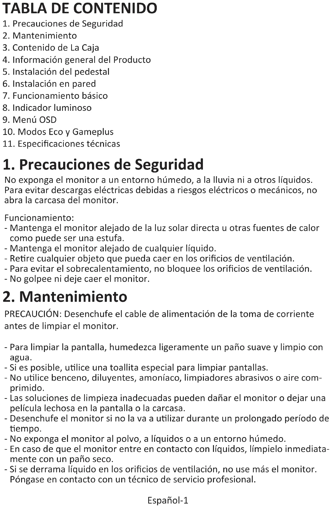 NINGUNA Permite cambiar a la entrada de señal DP HDMI1 (2.0) NINGUNA Permite cambiar a la entrada de señal HDMI HDMI2 (1.4) HDMI3 (1.4) Brillo/ Contraste Brillo 0-100 Permite ajustar el brillo de la pantalla Nivel de negro 0-100 Ajustar nivel de negro Contraste 0-100 Permite ajustar el contraste de la pantalla DCR Acvado Permite acvar la función DCR Desacvado Permite desacvar la función DCR Configuración del color Gamma 1,8 2,0 2,2 2,4 2,6 Permite establecer el complemento Gamma Modo Imagen Estándar, Imagen Película, Juego FPS, RTS Permite establecer el modo visual de acuerdo con la acvidad Temperatura color Cálida, Fría, Usuario Permite seleccionar la temperatura de color Permite establecer nivel de filtrado de luz azulLuz Azul baja 0-100 Maz 0-100 Permite ajustar los niveles de maz Saturación 0-100 Permite ajustar los niveles de la saturación Nidez 0-100 Ajustar nidez de la pantalla Tiempo de respuesta Desacvada, Alta, Media, Baja Permite ajustar el empo de respuesta Reducción de ruido Desacvada, Alta, Media, Baja Acvado, Desacvado MPRT Acvado, Desacvado Acvar y desacvar MPRT Pantalla Relación de aspecto Pantalla panorámica, 4:3, 1:1, Automáco Permite seleccionar la relación de aspecto en pantalla Modo LED Normal, Parpadeo, Desacvado Seleccionar modo de visualización de LED Audio Silencio Acvado, Desacvado Permite acvar y desacvar el modo de silencio Volumen 0-100 Permite ajustar el volumen de audio Fuente de audio Fuente automáca, DP1, HDMI1, HDMI2, HDMI3 Permite seleccionar la entrada de señal de audio a través de DP o DP HDMI Configura- ción de la calidad de imagen Permite reducir la interferencia del ruido de la imagen causado por la interferencia de la fuente de señal Permite compensar la pantalla de escala de grises y fortalecer la expresión de la escala de grises Control de luminancia dinámicoEspañol-10 Menú principal Submenú Opciones Descripción Múlple Ventana Ventana múlple Desacvado, Modo PIP PBP 2Win, Permite seleccionar los modos PIP/PBP conforme al número de señales de entrada, etc. Entrada de ventana 2 secundaria HDMI 1, HDMI 2, HDMI 3, DP Permite realizar la selección conforme a la señal de entrada para el modo PIP/PBP Tamaño PIP Pequeño, Mediano, Grande Permite ajustar el tamaño de la ventana de visualización PIP/PBP Posición PIP Permite ajustar la posición de la ventana PIP/PBP Intercambiar NINGUNA Permite intercambiar las fuentes de señal PIP/PBP Menús OSD Idioma Permite establecer el idioma de los menús OSD Posición horizontal de los menús OSD 0-100 Permite ajustar la posición horizontal de los menús OSD Posición vercal de los menús OSD 0-100 Permite ajustar la posición vercal de los menús OSD Transparencia OSD 0-100 Ajustar la transparencia global de los menús OSD Tiempo de espera de los menús OSD 5-100 Permite establecer cuánto empo permanecerán abiertos los menús OSD después de que haya dejado de ulizarse Rotación del menú OSD Normal, 90, 180,