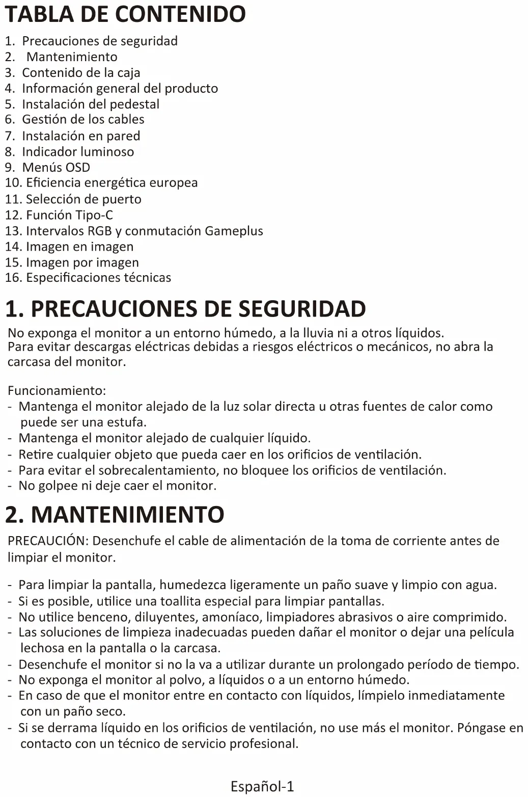No exponga el monitor a un entorno húmedo, a la lluvia ni a otros líquidos. Para evitar descargas eléctricas debidas a riesgos eléctricos o mecánicos, no abra la carcasa del monitor. PRECAUCIÓN: Desenchufe el cable de alimentación de la toma de corriente antes de limpiar el monitor. Funcionamiento: - Mantenga el monitor alejado de la luz solar directa u otras fuentes de calor como puede ser una estufa. - Mantenga el monitor alejado de cualquier líquido. - Rere cualquier objeto que pueda caer en los orificios de venlación. - Para evitar el sobrecalentamiento, no bloquee los orificios de venlación. - No golpee ni deje caer el monitor. - Para limpiar la pantalla, humedezca ligeramente un paño suave y limpio con agua. - Si es posible, ulice una toallita especial para limpiar pantallas. - No ulice benceno, diluyentes, amoníaco, limpiadores abrasivos o aire comprimido. - Las soluciones de limpieza inadecuadas pueden dañar el monitor o dejar una película lechosa en la pantalla o la carcasa. - Desenchufe el monitor si no la va a ulizar durante un prolongado período de empo. - No exponga el monitor al polvo, a líquidos o a un entorno húmedo. - En caso de que el monitor entre en contacto con líquidos, límpielo inmediatamente con un paño seco. - Si se derrama líquido en los orificios de venlación, no use más el monitor. Póngase en contacto con un técnico de servicio profesional.3. Contenido de la caja Aviso legal: Español-2 Monitor Destornillador x 1 Tornillos M4*9 mm x 4(para la instalación en pared) Cable DP Pedestal: sección vercal Pedestal: base Cable Tipo-C x 1 Enchufes de silicona x 2 Cable de alimentación x 1 Adaptador de alimentaciónx 1