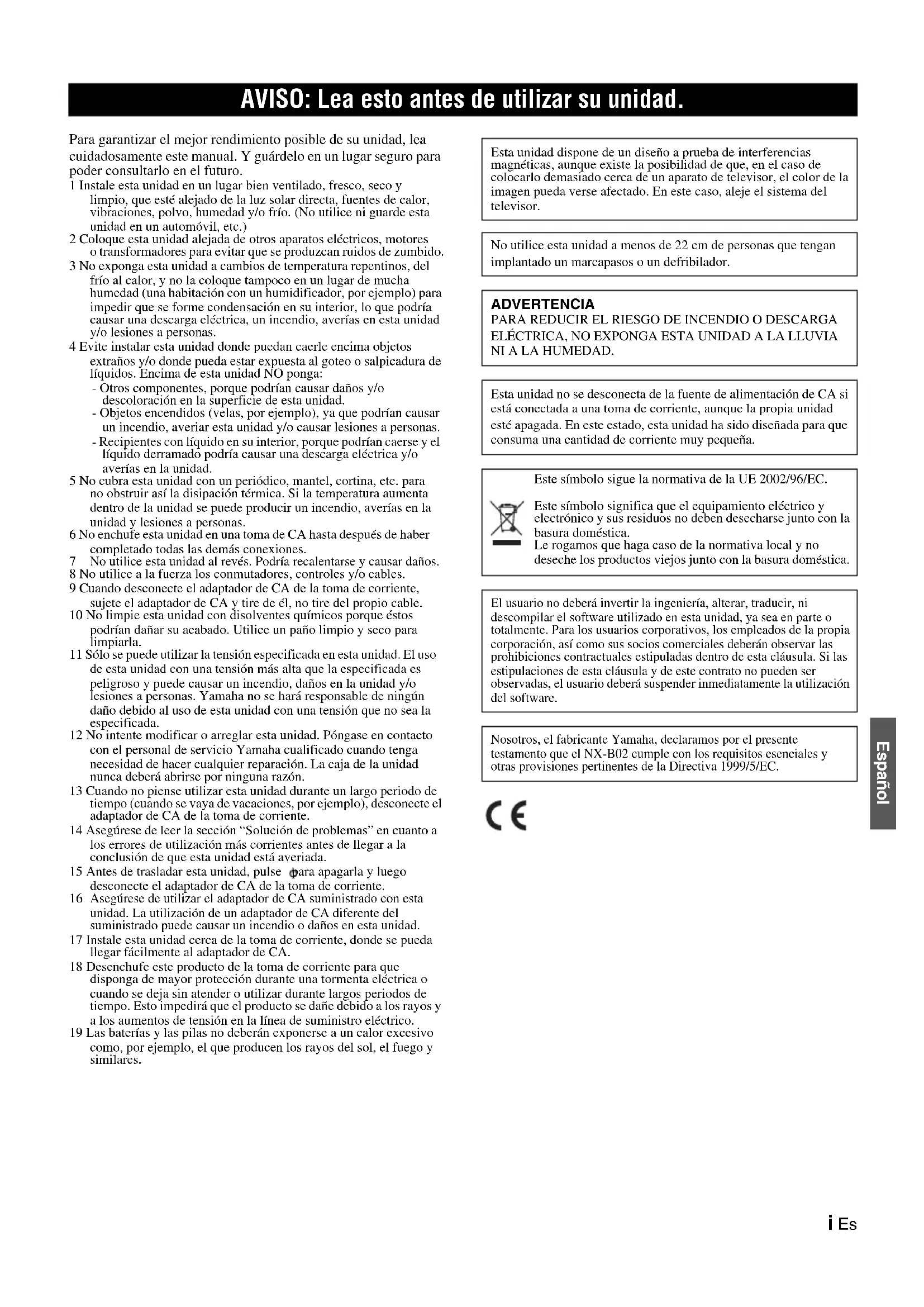 Asegúrese de utilizar el adaptador de CA suministrado con esta unidad. La utilización de un adaptador de CA diferente del suministrado puede causar un incendio o daños en esta unidad. 17 Instale esta unidad cerca de la toma de corriente, donde se pueda llegar fácilmente al adaptador de CA. 18 Desenchufe este producto de la toma de corriente para que disponga de mayor protección durante una tormenta eléctrica o cuando se deja sin atender o utilizar durante largos periodos de tiempo. Esto impedirá que el producto se dañe debido a los rayos y a los aumentos de tensión en la línea de suministro eléctrico. 19 Las baterías y las pilas no deberán exponerse a un calor excesivo como, por ejemplo, el que producen los rayos del sol, el fuego y similares. AVISO: Lea esto antes de utilizar su unidad. Esta unidad dispone de un diseño a prueba de interferencias magnéticas, aunque existe la posibilidad de que, en el caso de colocarlo demasiado cerca de un aparato de televisor, el color de la imagen pueda verse afectado. En este caso, aleje el sistema del televisor. No utilice esta unidad a menos de 22 cm de personas que tengan implantado un marcapasos o un defribilador. ADVERTENCIA PARA REDUCIR EL RIESGO DE INCENDIO O DESCARGA ELÉCTRICA, NO EXPONGA ESTA UNIDAD A LA LLUVIA NI A LA HUMEDAD. Esta unidad no se desconecta de la fuente de alimentación de CA si está conectada a una toma de corriente, aunque la propia unidad esté apagada. En este estado, esta unidad ha sido diseñada para que consuma una cantidad de corriente muy pequeña. El usuario no deberá invertir la ingeniería, alterar, traducir, ni descompilar el software utilizado en esta unidad, ya sea en parte o totalmente. Para los usuarios corporativos, los empleados de la propia corporación, así como sus socios comerciales deberán observar las prohibiciones contractuales estipuladas dentro de esta cláusula. Si las estipulaciones de esta cláusula y de este contrato no pueden ser observadas, el usuario deberá suspender inmediatamente la utilización del software. Nosotros, el fabricante Yamaha, declaramos por el presente testamento que el NX-B02 cumple con los requisitos esenciales y otras provisiones pertinentes de la Directiva 1999/5/EC. Este símbolo sigue la normativa de la UE 2002/96/EC. Este símbolo significa que el equipamiento eléctrico y electrónico y sus residuos no deben desecharse junto con la basura doméstica. Le rogamos que haga caso de la normativa local y no deseche los productos viejos junto con la basura doméstica.1 Es