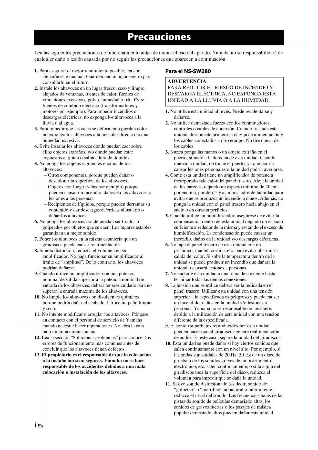 100 dBNS-SW280NS-C385 Problema Posible causa SoluciónEl conmutador POWER se encuentra en la posición ON, pero el subwoofer no funciona.El cable de alimentación no está conectado correctamente.Coloque el conmutador POWER en la posición OFF, y compruebe que el cable de alimentación esté conectado correctamente.No hay sonido. El control VOLUME está colocado en la posición 0.Suba el control VOLUME.El cable del subwoofer no está conectado correctamente.Compruebe que el cable del subwoofer esté conectado correctamente.El subwoofer es demasiado silencioso.El material original no contiene demasiados graves.Pruebe a reproducir un material original que contenga más graves.Las ondas flotantes eliminan los sonidos graves.Vuelva a colocar el subwoofer o divida las superficies paralelas de la pared, colocando estanterías para libros u otros objetos de gran tamaño en la pared.6 Es Español ■ Altavoces frontales, surround (NS-B285), y central (NS-C385) Tipo NS-B285.................. Suspensión acústica de gama completatipo blindado no magnéticamenteNS-C385...................................Suspensión acústica de 2 víastipo blindado no magnéticamenteDriverNS-B285..................................... Altavoz con cono de 6,5 cmNS-C385................ Woofer: Altavoz con cono de 6,5 cm x 2Tweeter: Altavoz con cúpula balanceada de 2,5 cmPotencia de entrada nominalNS-B285............................................................................ 30 WNS-C385............................................................................ 50 WPotencia de entrada máximaNS-B285............................................................................ 80 WNS-C385.......................................................................... 100 W Impedancia............................................................................ 6 Ω Respuesta de frecuencia................................. 110 Hz–40 kHz Sensibilidad NS-B285.......................................................81 dB/2,83 V, 1 m NS-C385.......................................................84 dB/2,83 V, 1 m Frecuencia de inversión NS-C385........................................................................... 8 kHz Dimensiones (An x Al x Pr)NS-B285.............................. 90 x 90 x 109 mm (sin pedestal)90 x 120 x 123 mm (con pedestal)NS-C385........................................................ 220 x 90 x 109 mm Peso NS-B285.................................................0,45 kg (sin pedestal) NS-C385 .......................................................................... 1,0 kg ■ Subwoofer (NS-SW280) Tipo ......................Advanced Ya m a h a Active Servo Technology Driver .............................................Woofer con cono de 16 cm tipo blindado no magnéticamente Potencia de salida................50 W (100 Hz, 5 Ω, 10% T.H.D) Potencia dinámica................................................... 100 W, 5 Ω Impedancia de entrada......... INPUT (jack de patilla 1P RCA):10 kΩ Respuesta de frecuencia....................................30 Hz–160 Hz Sensibilidad de entrada.... INPUT (jack de patilla 1P RCA):80 mV (50 Hz, 50 W/5 Ω)AlimentaciónModelos para los EE.UU. y Canadá ...........CA 120 V, 60 Hz Modelo para Australia .................................CA 240 V, 50 Hz Modelos para el Reino Unido y Europa ....CA 230 V, 50 HzModelos para China, Corea, Asia, y Modelos genéricos......... CA 110–120/220–240 V, 50/60 Hz Dimensiones (An x Al x Pr) ..................262 x 264 x 316 mm Peso ..................................................................................... 6,9 kg Las especificaciones están sujetas a cambio sin previo aviso. Garantía limitada para el Área Económica Europea (AEE) y Suiza Gracias por haber elegido un producto Yamaha. En el caso poco probable de que su producto Yamaha necesite el servicio que concede la garantía, póngase en contacto por favor con el concesionario a quien adquirió el producto. Si usted tiene alguna dificultad, póngase en contacto por favor con la oficina representativa de Yamaha en su país. Podrá encontrar todos los detalles necesarios en nuestros sitios Web (http://www.yamaha-hifi.com/ o http://www.yamaha-uk.com/ para los residentes del Reino Unido). El producto tiene una garantía de dos años, a partir de la fecha de la compra original, que cubre las reparaciones de las averías que pueda tener debido a defectos en la mano de obra o en los materiales empleados en su fabricación. Yamaha se compromete, sujeto a las condiciones listadas más abajo, a reparar el producto o cualquier pieza (o piezas) que tenga defectos, o a sustituirlo, a discreción de Yamaha, sin cobrar ningún honorario por las piezas o la mano de obra. Yamaha se reserva el derecho de reemplazar un producto por otro de clase y/o precio y condiciones similares, en el caso de que éste no se fabrique más o se considere que las reparaciones resultan poco económicas.Condiciones de la garantía 1. El producto defectuoso DEBERÁ ir acompañado de la factura o recibo de venta original (que muestre la fecha de la compra, el código del producto y el nombre del concesionario), junto con una explicación que describa detalladamente la avería. Si falta esta prueba clara de la compra, Yamaha se reserva el derecho a no proveer el servicio de reparaciones gratis, y el producto podrá ser devuelto al cliente corriendo éste con todos los gastos relacionados con el envío. 2. El producto DEBERÁ haber sido adquirido en el establecimiento de un concesionario Yamaha AUTORIZADO dentro del Área Económica Europea (AEE) o Suiza. 3. El producto no deberá haber sido sometido a ninguna modificación ni alteración, a menos que ésta haya sido autorizada por escrito por Yamaha.