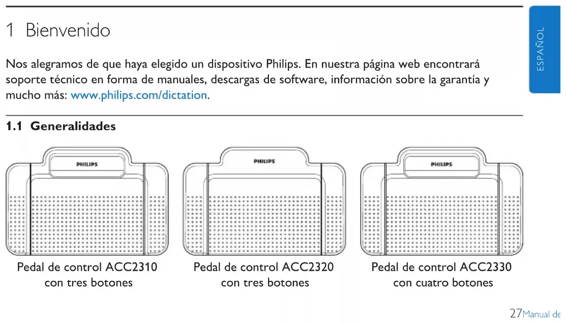 2 327Manual del usuario ESPAÑOL 1 Bienvenido Nos alegramos de que haya elegido un dispositivo Philips. En nuestra página web encontrará soporte técnico en forma de manuales, descargas de software, información sobre la garantía y mucho más: www.philips.com/dictation.