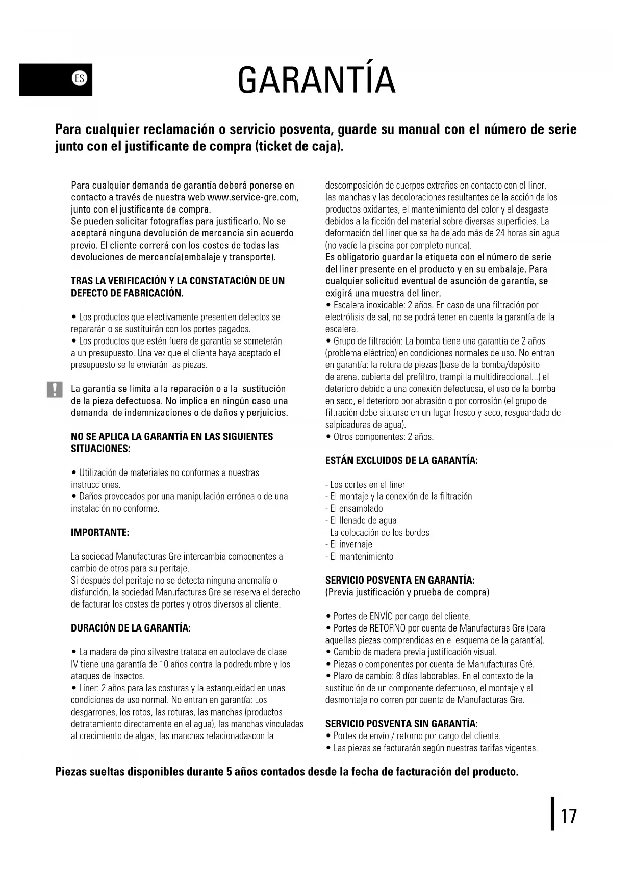 When you have installed your pool and all the components are assembled, we thank you for classifying and recycling all the packaging. IMPEGTRCGR 19 14 01 2019.indd 16 26/3/19 9:5517 GARANTÍA Para cualquier reclamación o servicio posventa, guarde su manual con el número de serie junto con el justificante de compra (ticket de caja). Para cualquier demanda de garantía deberá ponerse en contacto a través de nuestra web www.service-gre.com, junto con el justificante de compra. Se pueden solicitar fotografías para justificarlo. No se aceptará ninguna devolución de mercancía sin acuerdo previo. El cliente correrá con los costes de todas las devoluciones de mercancía(embalaje y transporte). TRAS LA VERIFICACIÓN Y LA CONSTATACIÓN DE UN DEFECTO DE FABRICACIÓN.