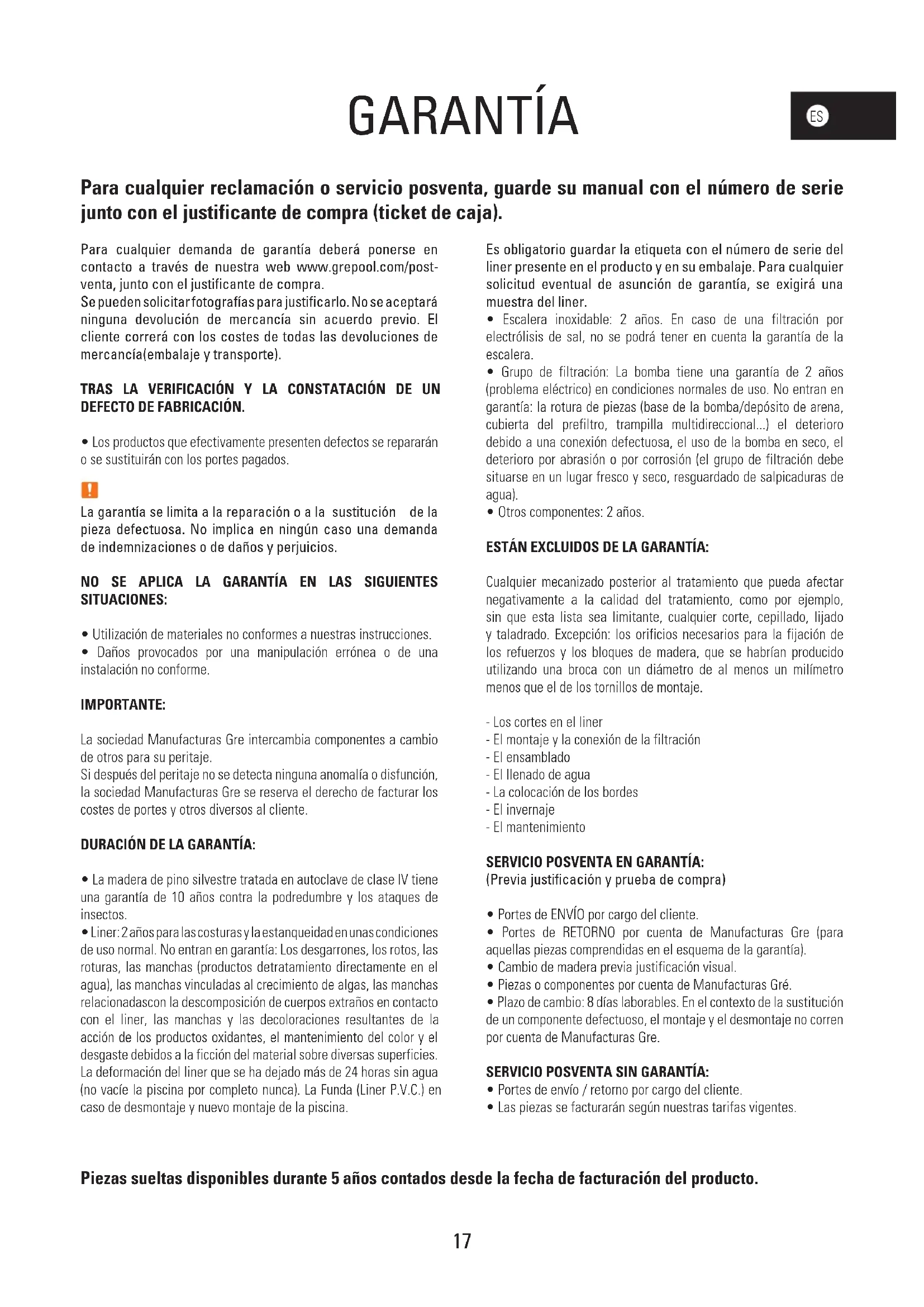 GARANTÍA Para cualquier reclamación o servicio posventa, guarde su manual con el número de serie junto con el justificante de compra (ticket de caja). Piezas sueltas disponibles durante 5 años contados desde la fecha de facturación del producto. Para cualquier demanda de garantía deberá ponerse en contacto a través de nuestra web www.grepool.com/post- venta, junto con el justificante de compra. Se pueden solicitar fotografías para justificarlo. No se aceptará ninguna devolución de mercancía sin acuerdo previo. El cliente correrá con los costes de todas las devoluciones de mercancía(embalaje y transporte). TRAS LA VERIFICACIÓN Y LA CONSTATACIÓN DE UN DEFECTO DE FABRICACIÓN.