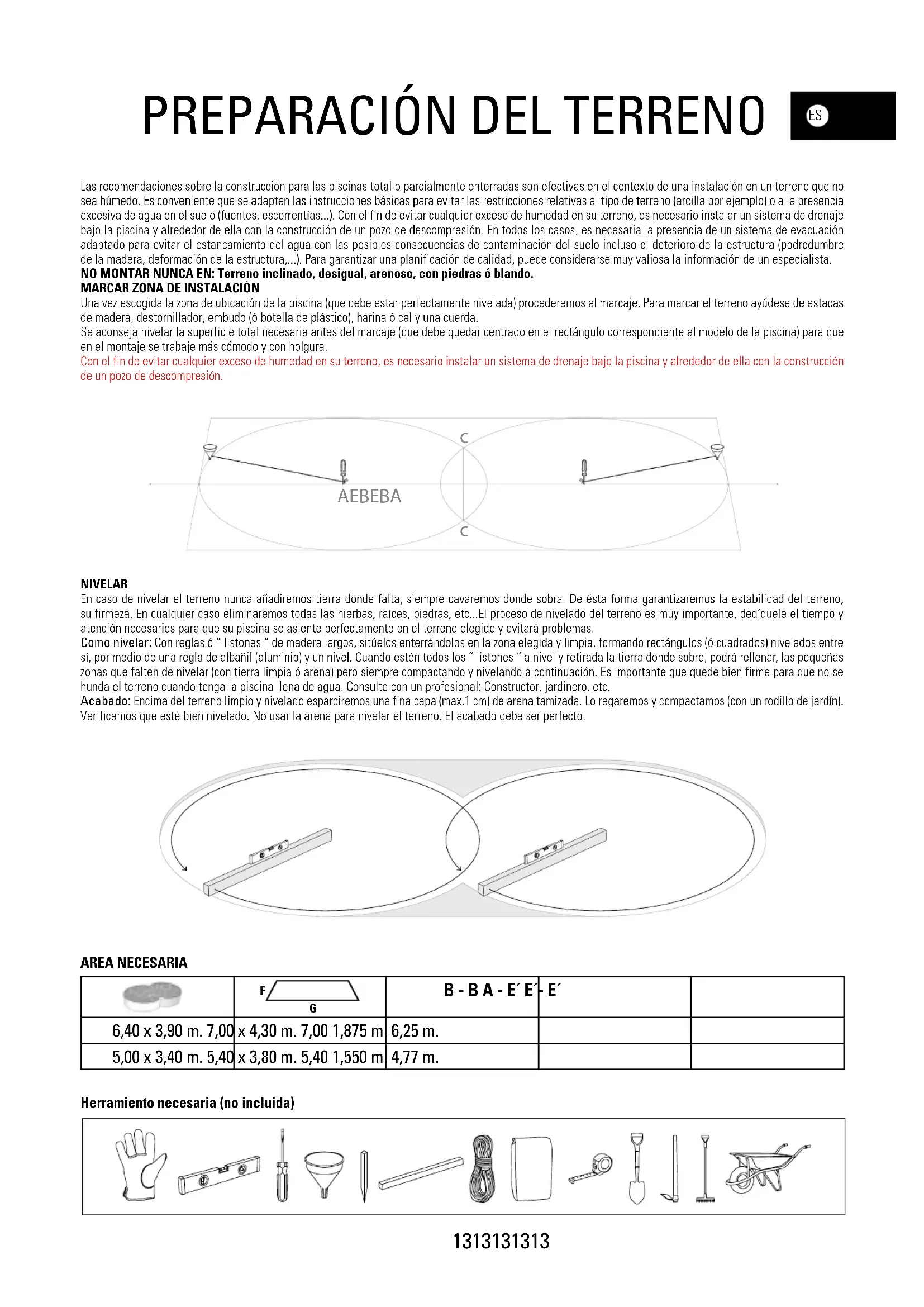 Las recomendaciones sobre la construcción para las piscinas total o parcialmente enterradas son efectivas en el contexto de una instalación en un terreno que no sea húmedo. Es conveniente que se adapten las instrucciones básicas para evitar las restricciones relativas al tipo de terreno (arcilla por ejemplo) o a la presencia excesiva de agua en el suelo (fuentes, escorrentías...). Con el fin de evitar cualquier exceso de humedad en su terreno, es necesario instalar un sistema de drenaje bajo la piscina y alrededor de ella con la construcción de un pozo de descompresión. En todos los casos, es necesaria la presencia de un sistema de evacuación adaptado para evitar el estancamiento del agua con las posibles consecuencias de contaminación del suelo incluso el deterioro de la estructura (podredumbre de la madera, deformación de la estructura,...). Para garantizar una planificación de calidad, puede considerarse muy valiosa la información de un especialista. NO MONTAR NUNCA EN: Terreno inclinado, desigual, arenoso, con piedras ó blando. MARCAR ZONA DE INSTALACIÓN Una vez escogida la zona de ubicación de la piscina (que debe estar perfectamente nivelada) procederemos al marcaje. Para marcar el terreno ayúdese de estacas de madera, destornillador, embudo (ó botella de plástico), harina ó cal y una cuerda. Se aconseja nivelar la superficie total necesaria antes del marcaje (que debe quedar centrado en el rectángulo correspondiente al modelo de la piscina) para que en el montaje se trabaje más cómodo y con holgura. Con el fin de evitar cualquier exceso de humedad en su terreno, es necesario instalar un sistema de drenaje bajo la piscina y alrededor de ella con la construcción de un pozo de descompresión.NIVELAR En caso de nivelar el terreno nunca añadiremos tierra donde falta, siempre cavaremos donde sobra. De ésta forma garantizaremos la estabilidad del terreno, su firmeza. En cualquier caso eliminaremos todas las hierbas, raíces, piedras, etc...El proceso de nivelado del terreno es muy importante, dedíquele el tiempo y atención necesarios para que su piscina se asiente perfectamente en el terreno elegido y evitará problemas. Como nivelar: Con reglas ó “ listones “ de madera largos, sitúelos enterrándolos en la zona elegida y limpia, formando rectángulos (ó cuadrados) nivelados entre sí, por medio de una regla de albañil (aluminio) y un nivel. Cuando estén todos los “ listones “ a nivel y retirada la tierra donde sobre, podrá rellenar, las pequeñas zonas que falten de nivelar (con tierra limpia ó arena) pero siempre compactando y nivelando a continuación. Es importante que quede bien firme para que no se hunda el terreno cuando tenga la piscina llena de agua. Consulte con un profesional: Constructor, jardinero, etc. Acabado: Encima del terreno limpio y nivelado esparciremos una fina capa (max.1 cm) de arena tamizada. Lo regaremos y compactamos (con un rodillo de jardín). Verificamos que esté bien nivelado. No usar la arena para nivelar el terreno. El acabado debe ser perfecto.