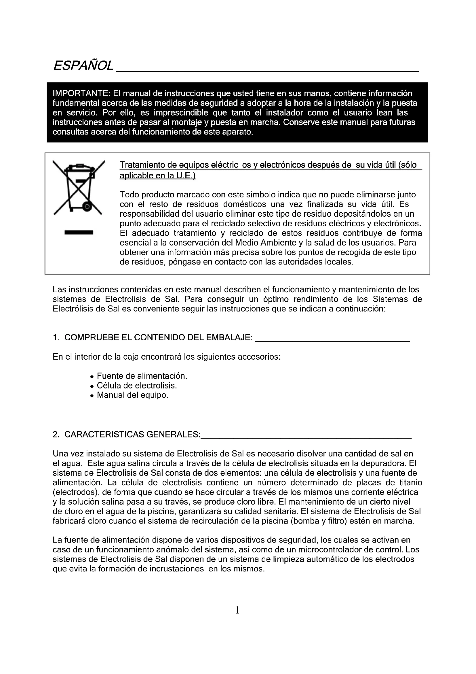 Tratamiento de equipos eléctric os y electrónicos después de su vida útil (sólo aplicable en la U.E.) Todo producto marcado con este símbolo indica que no puede eliminarse junto con el resto de residuos domésticos una vez finalizada su vida útil. Es responsabilidad del usuario eliminar este tipo de residuo depositándolos en un punto adecuado para el reciclado selectivo de residuos eléctricos y electrónicos. El adecuado tratamiento y reciclado de estos residuos contribuye de forma esencial a la conservación del Medio Ambiente y la salud de los usuarios. Para obtener una información más precisa sobre los puntos de recogida de este tipo de residuos, póngase en contacto con las autoridades locales. Las instrucciones contenidas en este manual describen el funcionamiento y mantenimiento de los sistemas de Electrolisis de Sal. Para conseguir un óptimo rendimiento de los Sistemas de Electrólisis de Sal es conveniente seguir las instrucciones que se indican a continuación: