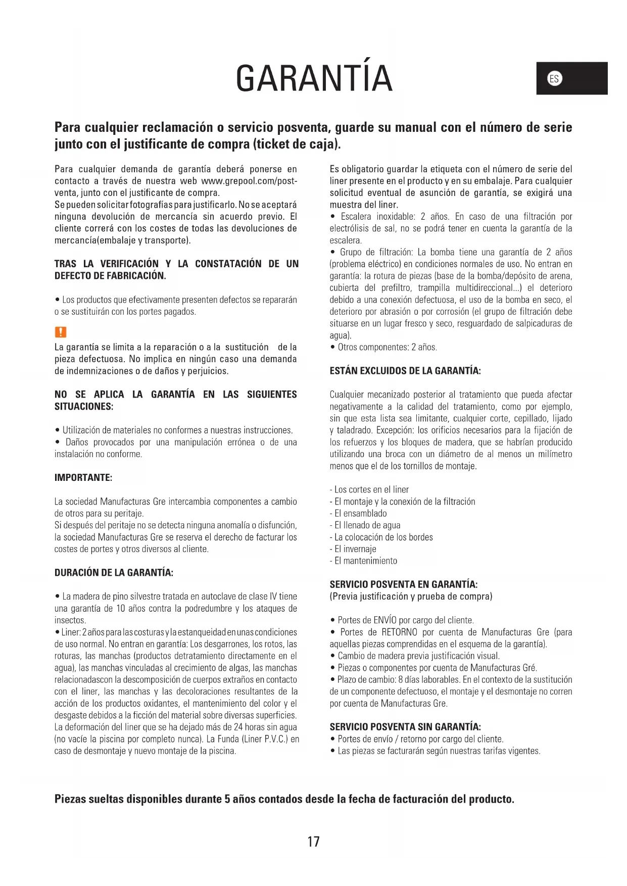 GARANTÍA Para cualquier reclamación o servicio posventa, guarde su manual con el número de serie junto con el justificante de compra (ticket de caja). Piezas sueltas disponibles durante 5 años contados desde la fecha de facturación del producto. Para cualquier demanda de garantía deberá ponerse en contacto a través de nuestra web www.grepool.com/post- venta, junto con el justificante de compra. Se pueden solicitar fotografías para justificarlo. No se aceptará ninguna devolución de mercancía sin acuerdo previo. El cliente correrá con los costes de todas las devoluciones de mercancía(embalaje y transporte). TRAS LA VERIFICACIÓN Y LA CONSTATACIÓN DE UN DEFECTO DE FABRICACIÓN.