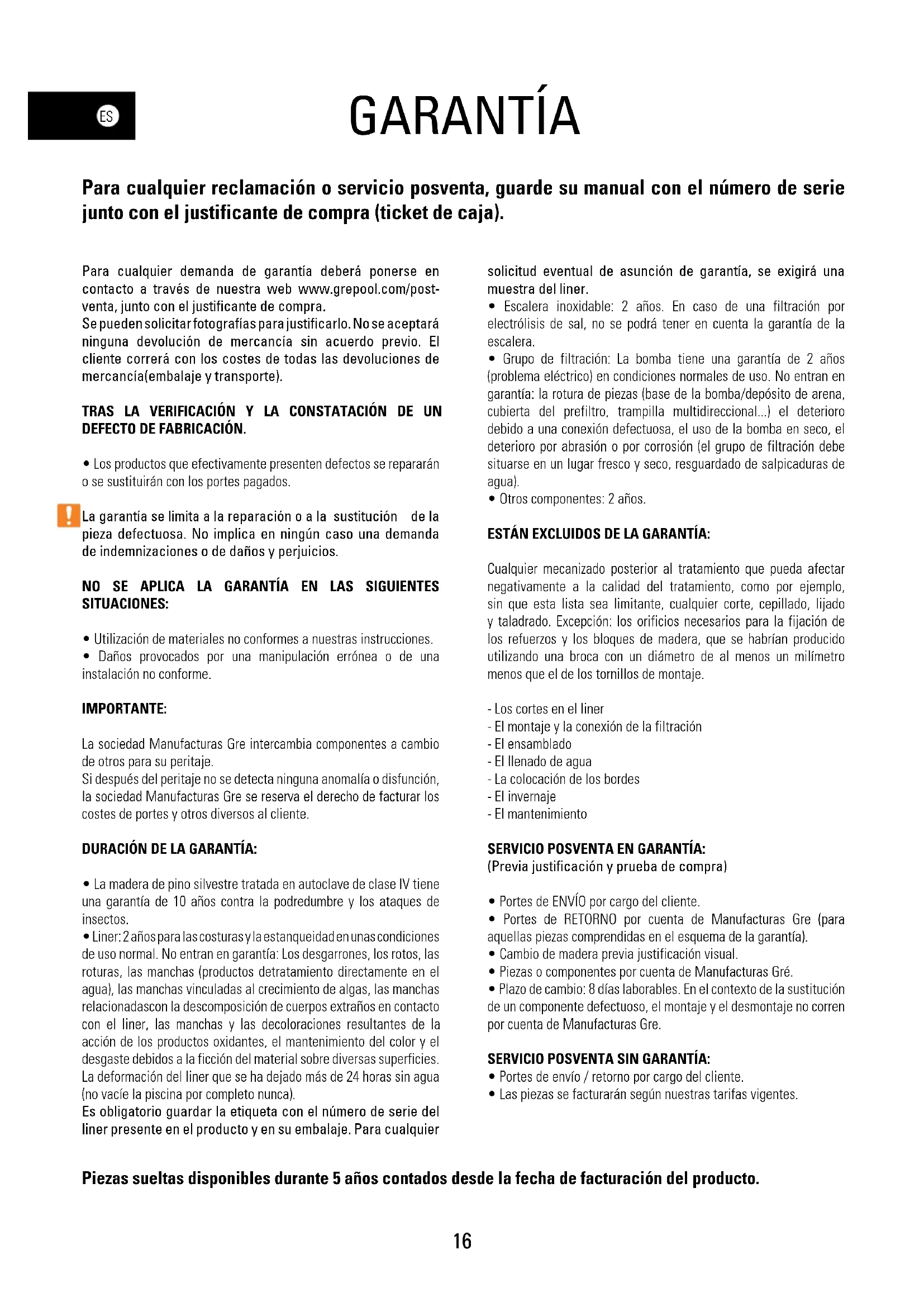 - Grupo de filtración: La bomba tiene una garantía de 2 años (problema eléctrico) en condiciones normales de uso. No entran en garantía: la rotura de piezas (base de la bomba/depósito de arena, cubierta del prefiltro, trampilla multidireccional...) el deterioro debido a una conexión defectuosa, el uso de la bomba en seco, el deterioro por abrasión o por corrosión (el grupo de filtración debe situarse en un lugar fresco y seco, resguardado de salpicaduras de agua).