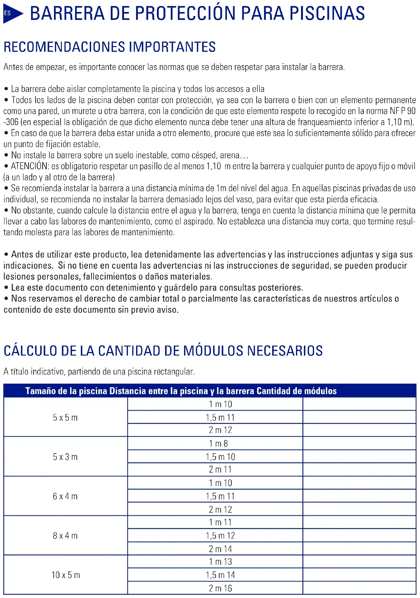 - La presencia de los padres y/u otro adulto responsable es necesaria cuando la piscina está ACCESIBLE. CONSEJOS DE SEGURIDADMemorice y fije cerca de la piscina los números de los servicios de socorro Emergencias 112 Bomberos: 112 SAMU: 112 Centro toxicológico: 91 562 04 20CALCUL DU NOMBRE NÉCESSAIRE DE MODULES A titre indicatift, en considèrant une piscine de forme rectangulaire Taille de la piscine Distance entre la piscine et la barrière Nombre de modules 5 x 5 m 1 m 10 1,5 m 11 2 m 12 5 x 3 m 1 m 8 1,5 m 10 2 m 11 6 x 4 m 1 m 10 1,5 m 11 2 m 12 8 x 4 m 1 m 11 1,5 m 12 2 m 14 10 x 5 m 1 m 13 1,5 m 14 2 m 16 BARRIÈRE SOUPLE DE PROTECTION POUR PISCINE